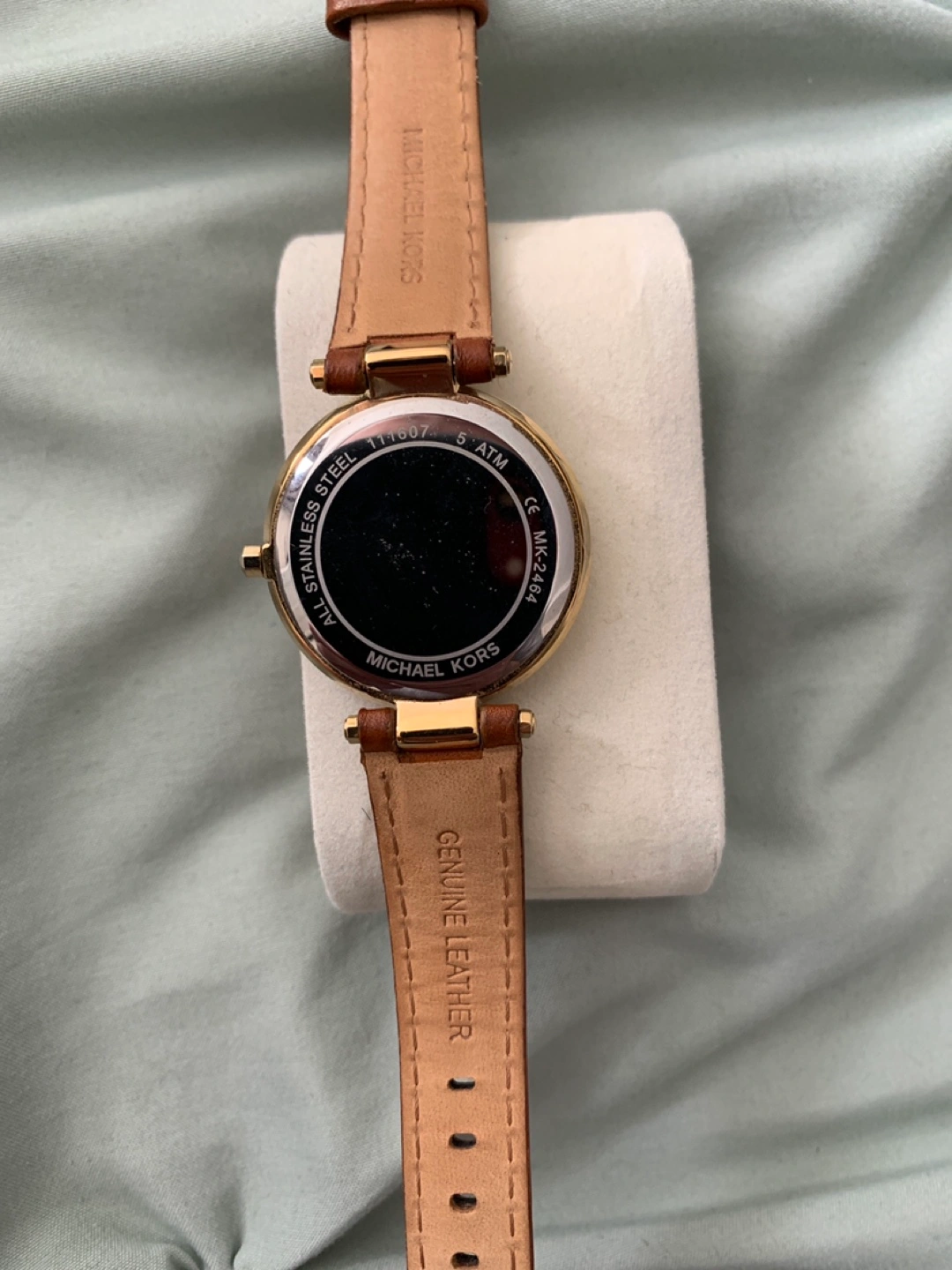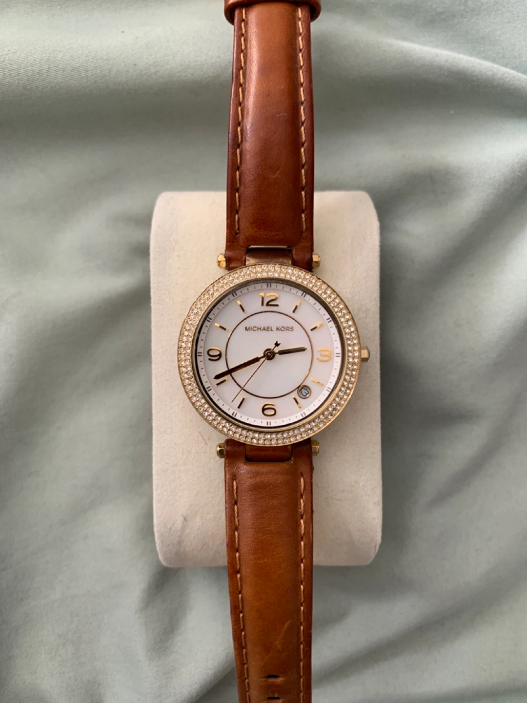 Elegant Michael Kors watch. Features a round white face, gold-tone accents, and brown leather strap. Quartz movement. Subtle crystal accents around the bezel. Pre-owned, in good condition. Needs new battery