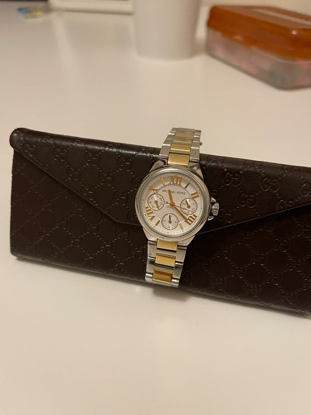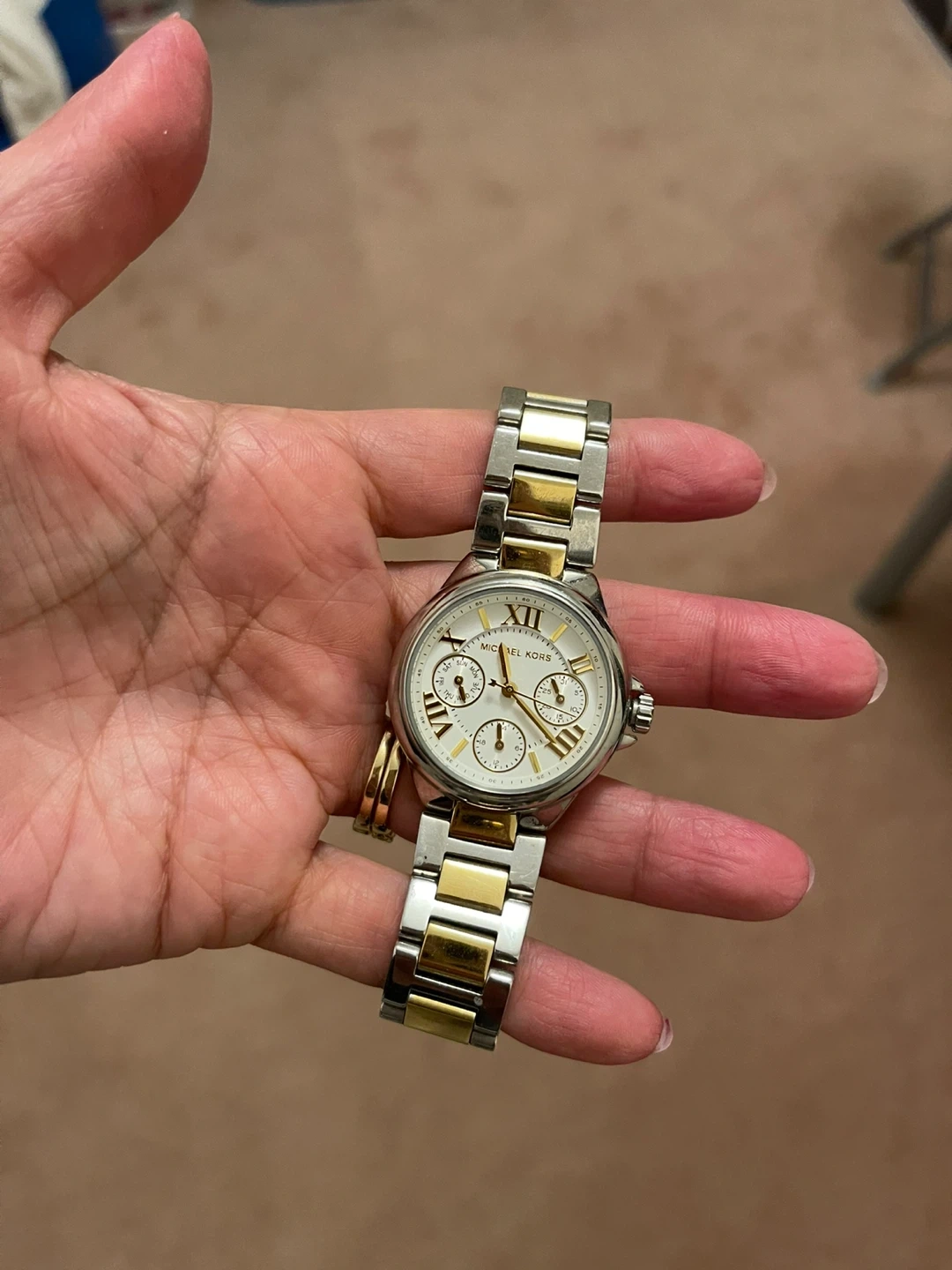 Selling a stylish Michael Kors women's watch. It features a beautiful combination of gold and silver tones on the band and a white face with chronograph details. It's in great condition and ready to add a touch of elegance to your wrist!