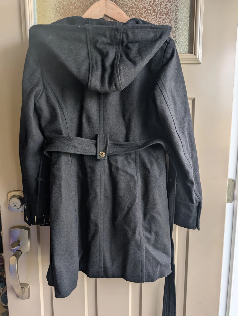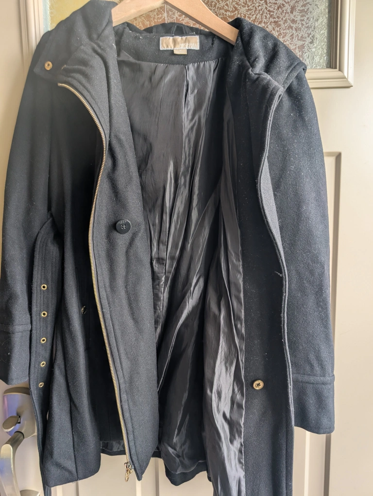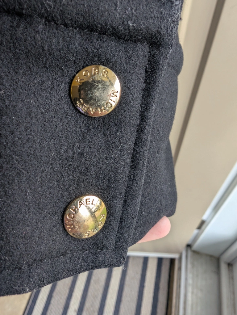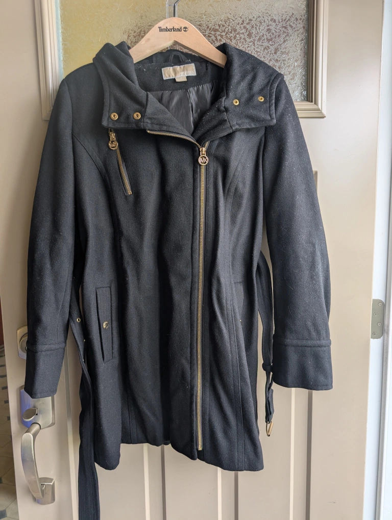 Womens size medium Michael Kors peacoat. Wool, belted, with gold accents and inner closure button. Full zipper front, 2 hip pockets with button closure, zippered chest pocket, 2 snap button clisures on cuffs. Outer is 60% wool, 30%polyester, 10% rayon. Lining is 100% polyester (silky). 32.5 inches shoulder to waist, 21 inches arm pit to arm pit. Worn but like new.