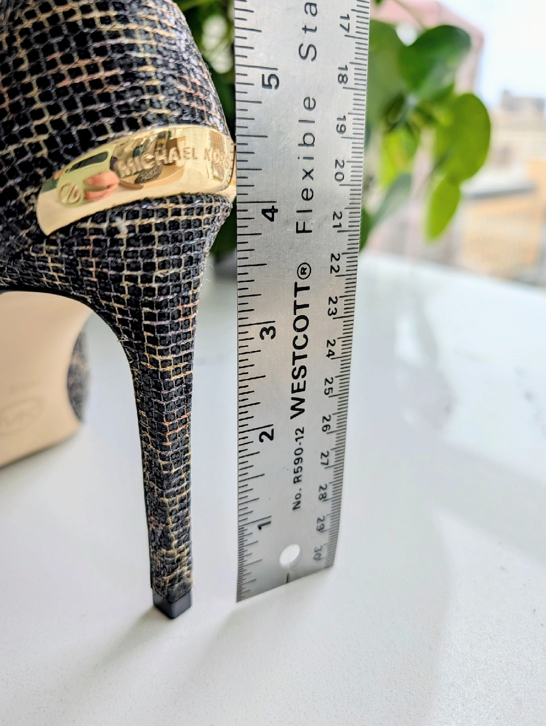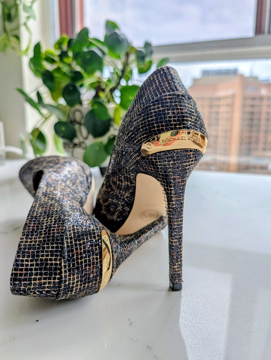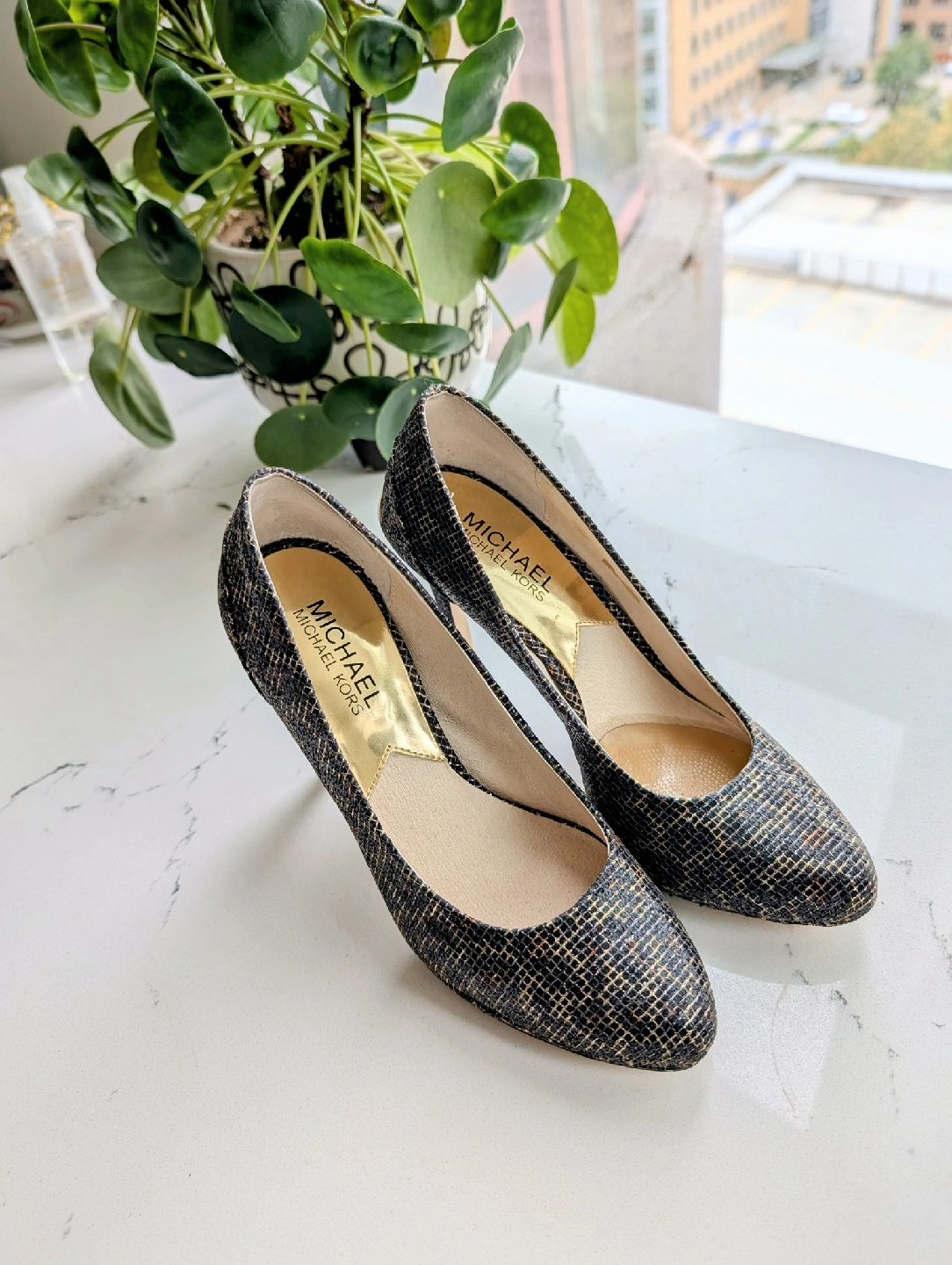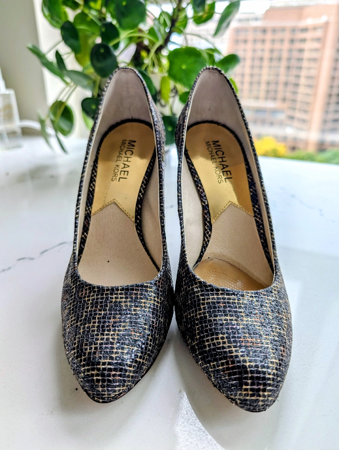 These are a pair of Michael Kors heels, perfect for adding a touch of elegance to any outfit! They feature a stylish pattern and are in great condition. Only been worn twice. I put an additional cushion in the left shoe for a better fit. Will include the other cushion (unused) in the box. Pick up near Bay and Gerrard.