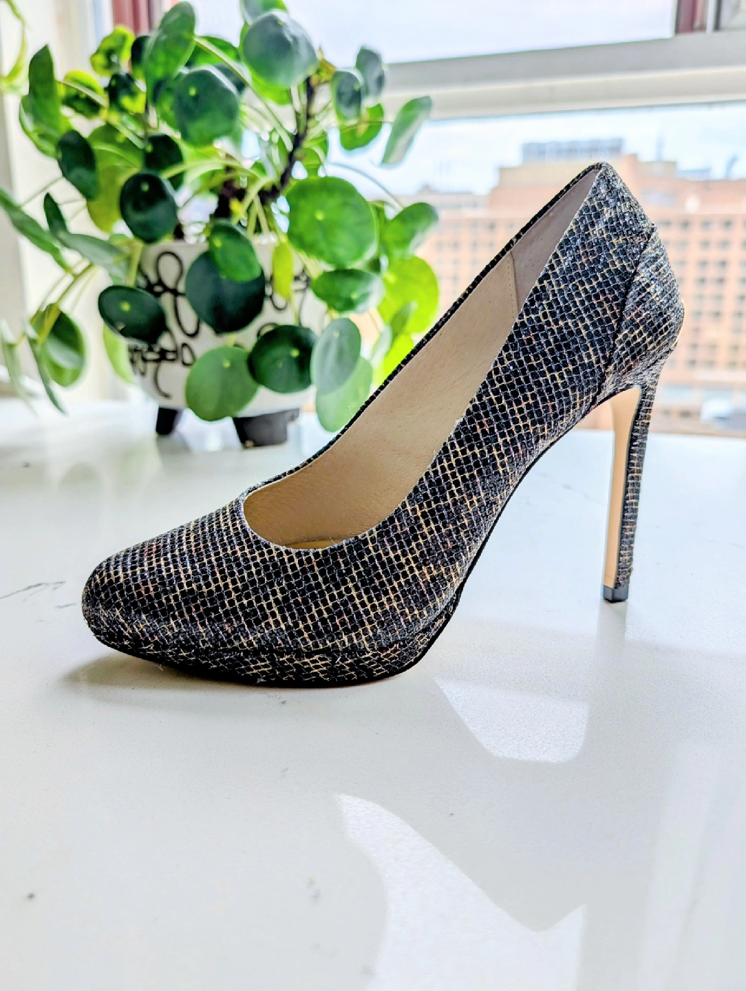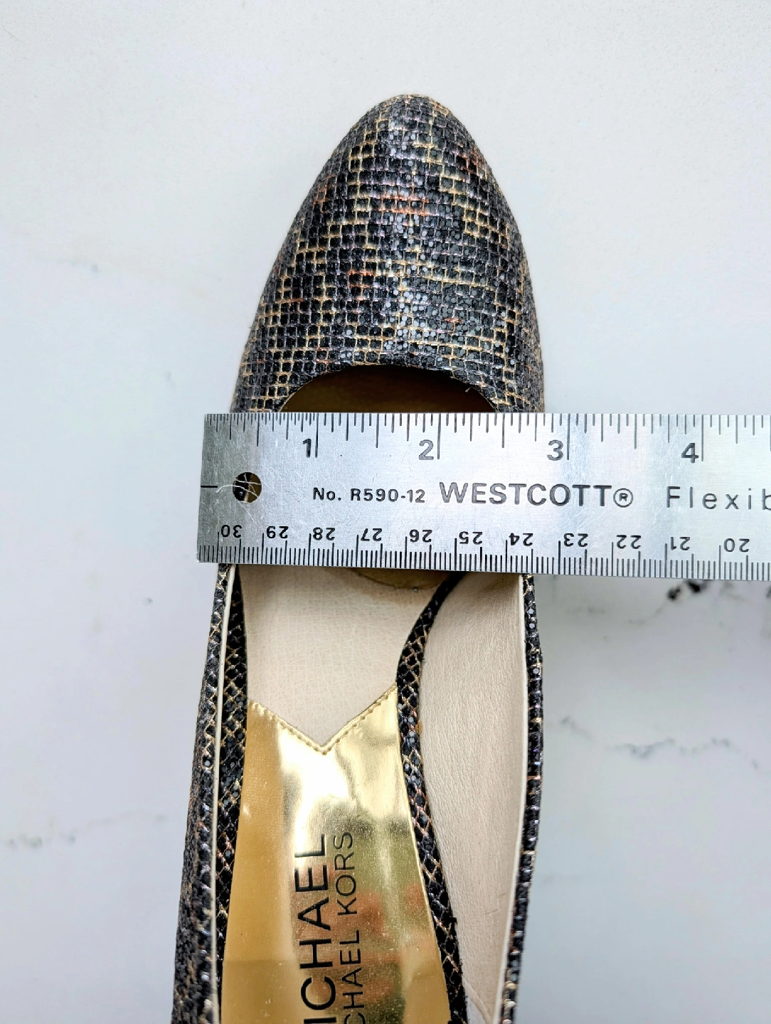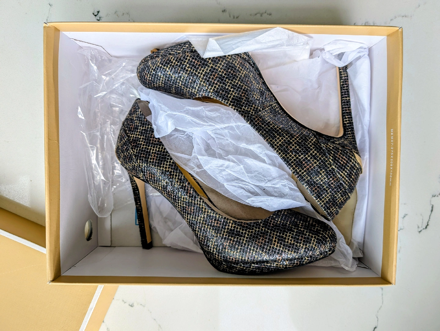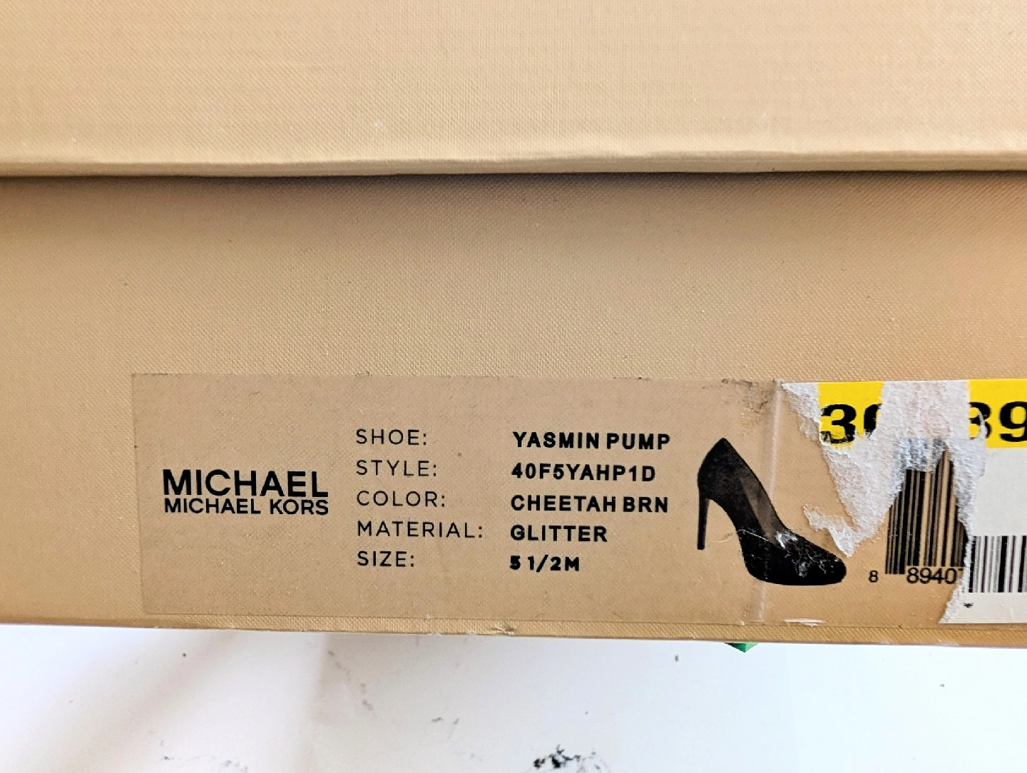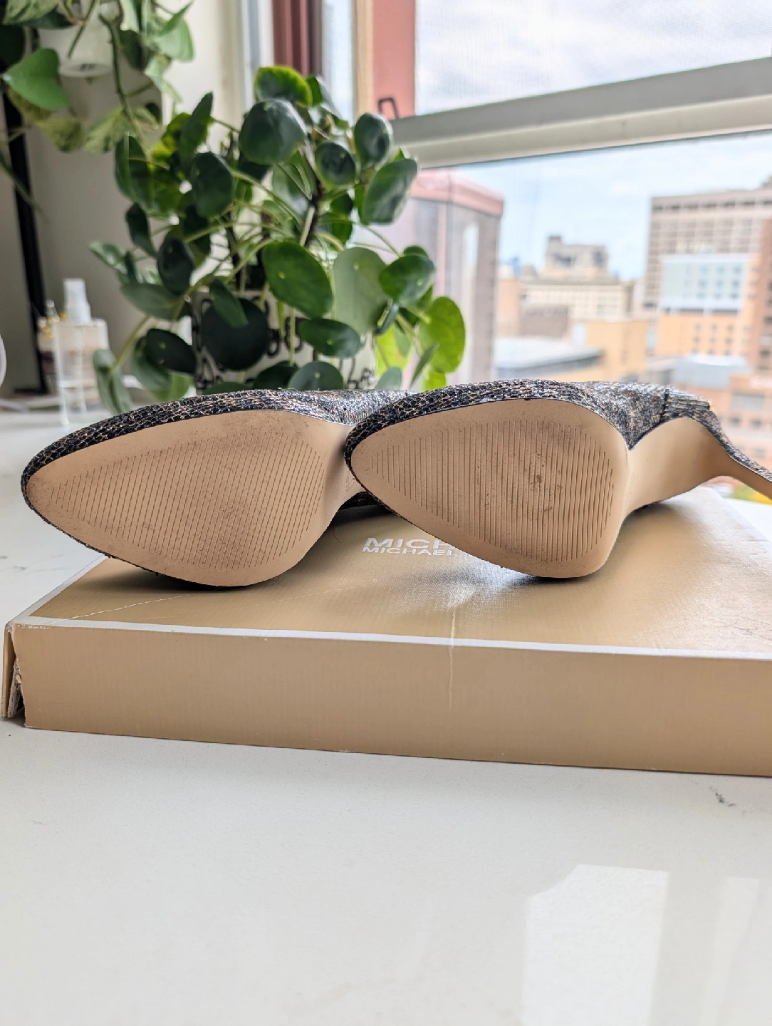 These are a pair of Michael Kors heels, perfect for adding a touch of elegance to any outfit! They feature a stylish pattern and are in great condition. Only been worn twice. I put an additional cushion in the left shoe for a better fit. Will include the other cushion (unused) in the box. Pick up near Bay and Gerrard.