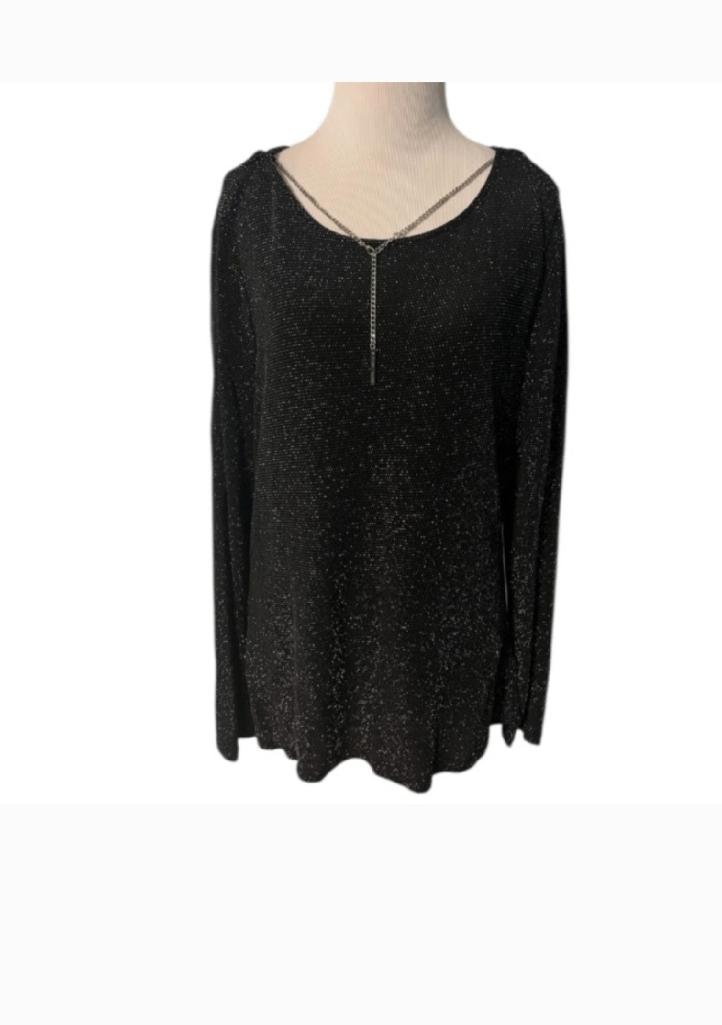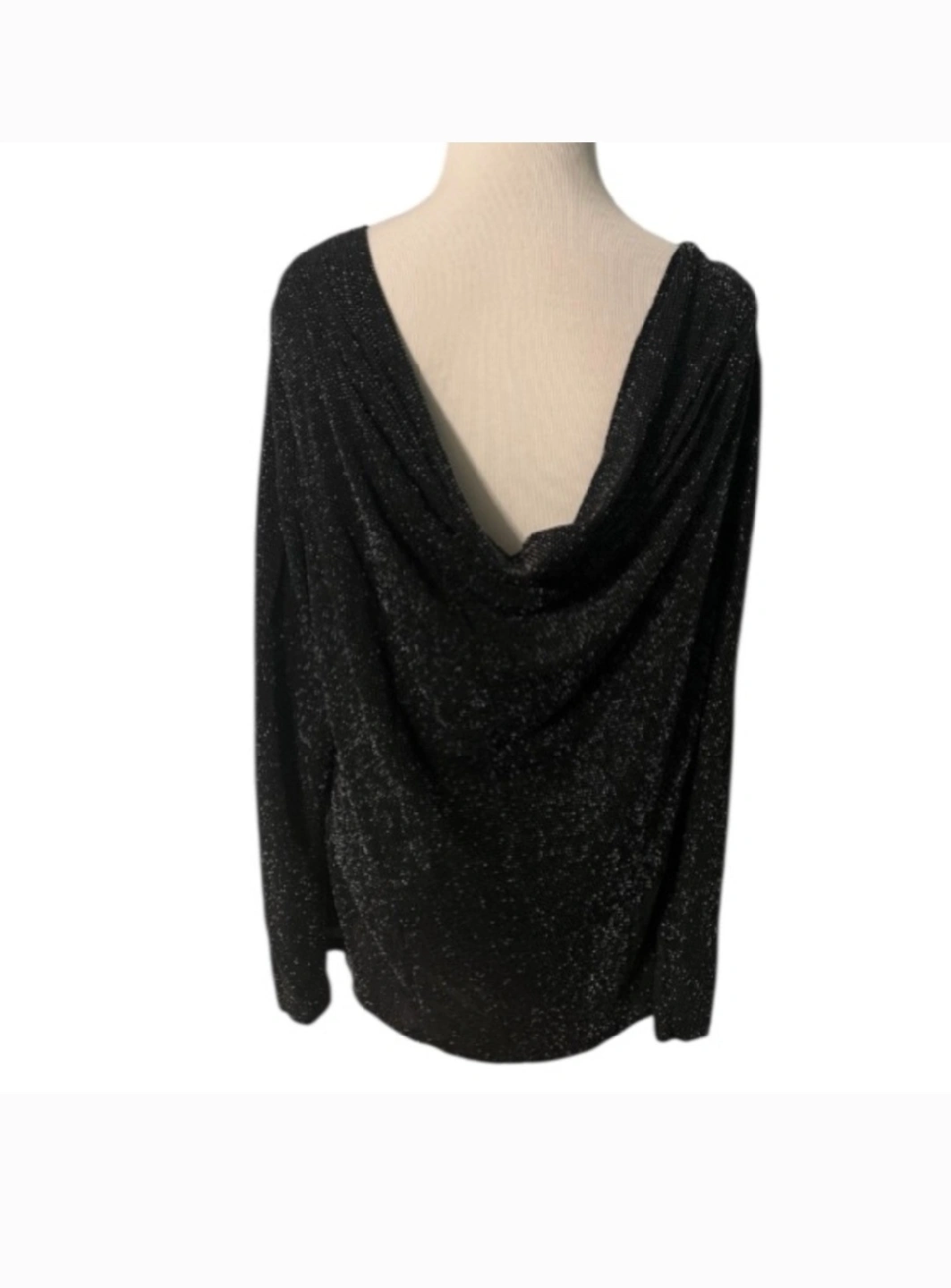 metallic Cowl-back top ,, knitted in a metallic blend this top showcases a skin barring cowl back elevated by a silver tone chain detail, necklace can be worn in front or back ., never did wear this top.,stretchy , very dressy , or wear with your favorite jeans .