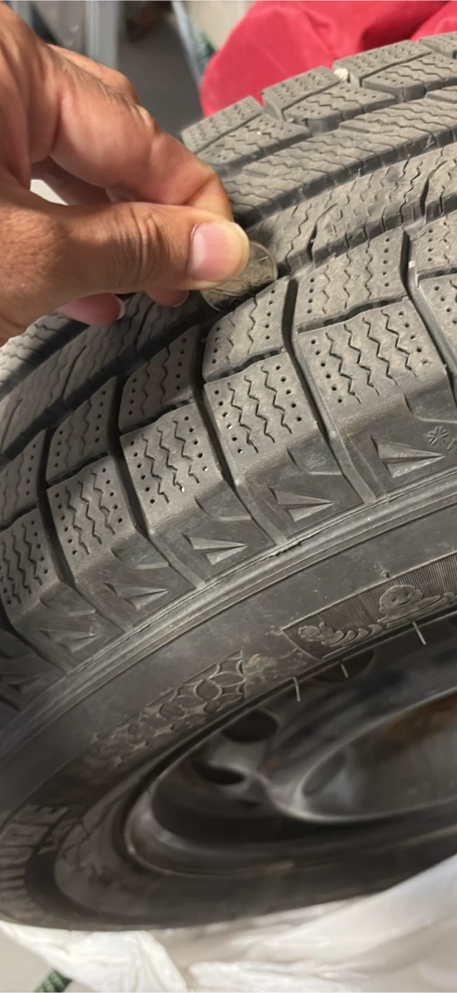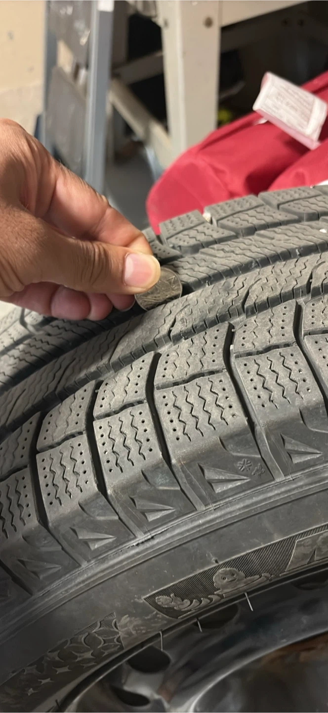 Selling a used Michelin winter tire. The pictures show the tire tread depth using a Canadian quarter for scale. Good for another season!