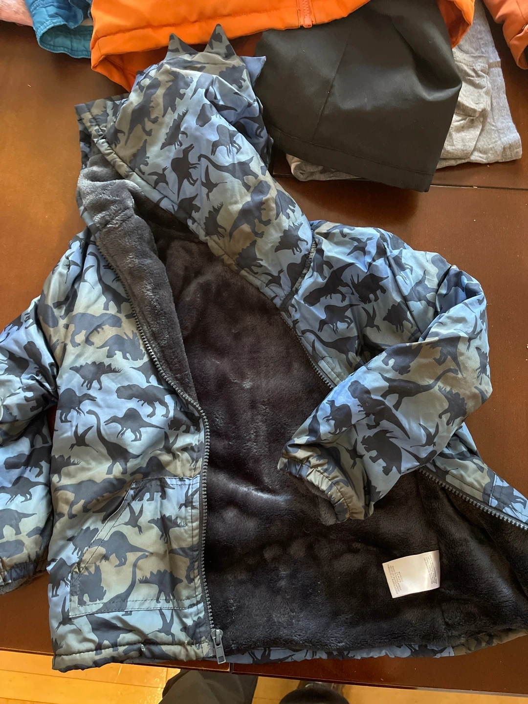 Cozy up your little one with this Mick Mack LTD winter jacket! It features a fun dinosaur print in shades of blue and grey. The jacket is a size 7 and has a warm, furry lining to keep your child snug during the colder months.