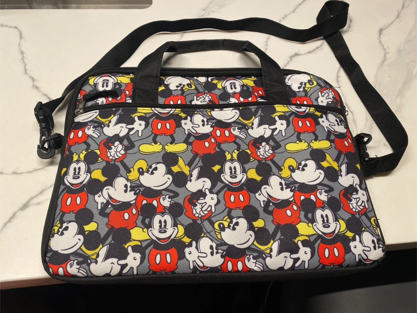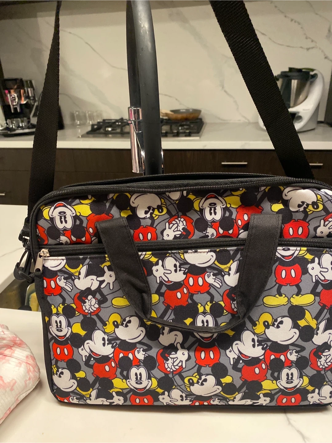 Here's a fun laptop bag featuring a Mickey Mouse pattern! It has a black adjustable shoulder strap and handles for easy carrying. There are multiple compartments inside to keep your laptop and accessories organized. Perfect for adding a bit of Disney charm to your workday or school day. Can fit two 15inch computers