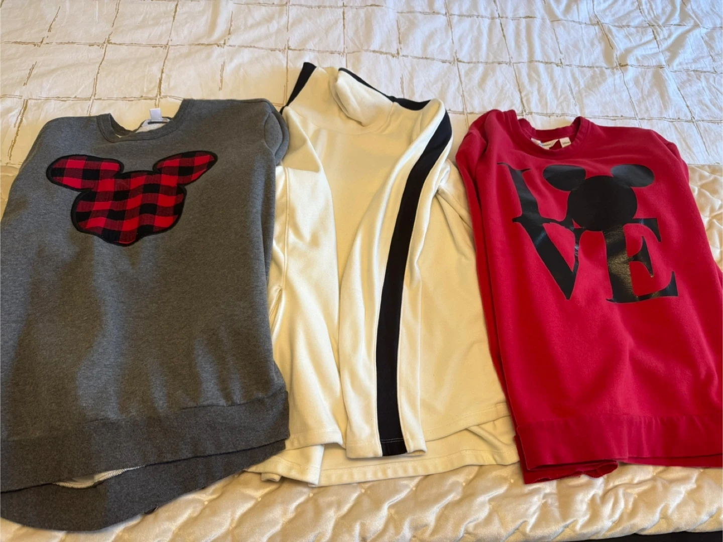 Selling a bundle of three Mickey Mouse sweatshirts! There's a grey one with a red and black plaid Mickey head, a cream-coloured one with black stripes down the sleeves, and a red one with 'LOVE' and a Mickey head. All in good condition! SIZE XXL WOMEN OR XL MEN