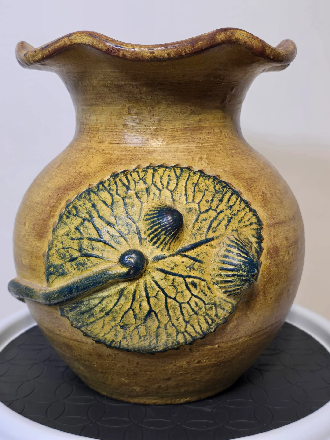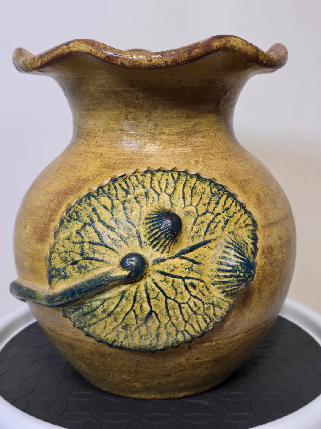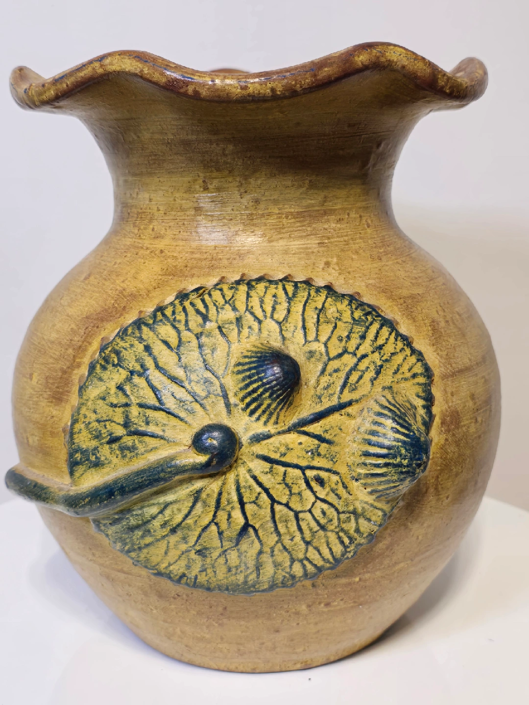 This beautiful studio art pottery vase features a unique, handcrafted design with a natural, rustic aesthetic. The vase is made from a beige or tan-colored clay, giving it an earthy and textured finish. A prominent, raised relief motif of a dark blue-green lily pad with detailed veins and seed pods wraps around the front of the vase. The top rim has a distinct ruffled or wavy edge, adding to its organic feel. This piece would make a striking decorative item for a home, adding a touch of natural artistry to any room. It is perfect for displaying dried floral arrangements or as a standalone piece of art. Key features: Type: Pottery vase Material: Ceramic / Stoneware Design: Hand-built, raised relief of a lily pad and seed pods Color: Textured beige/tan with dark blue-green details Style: Rustic, Studio Pottery, Folk Art Condition: Please refer to photos for a detailed view of the condition.
