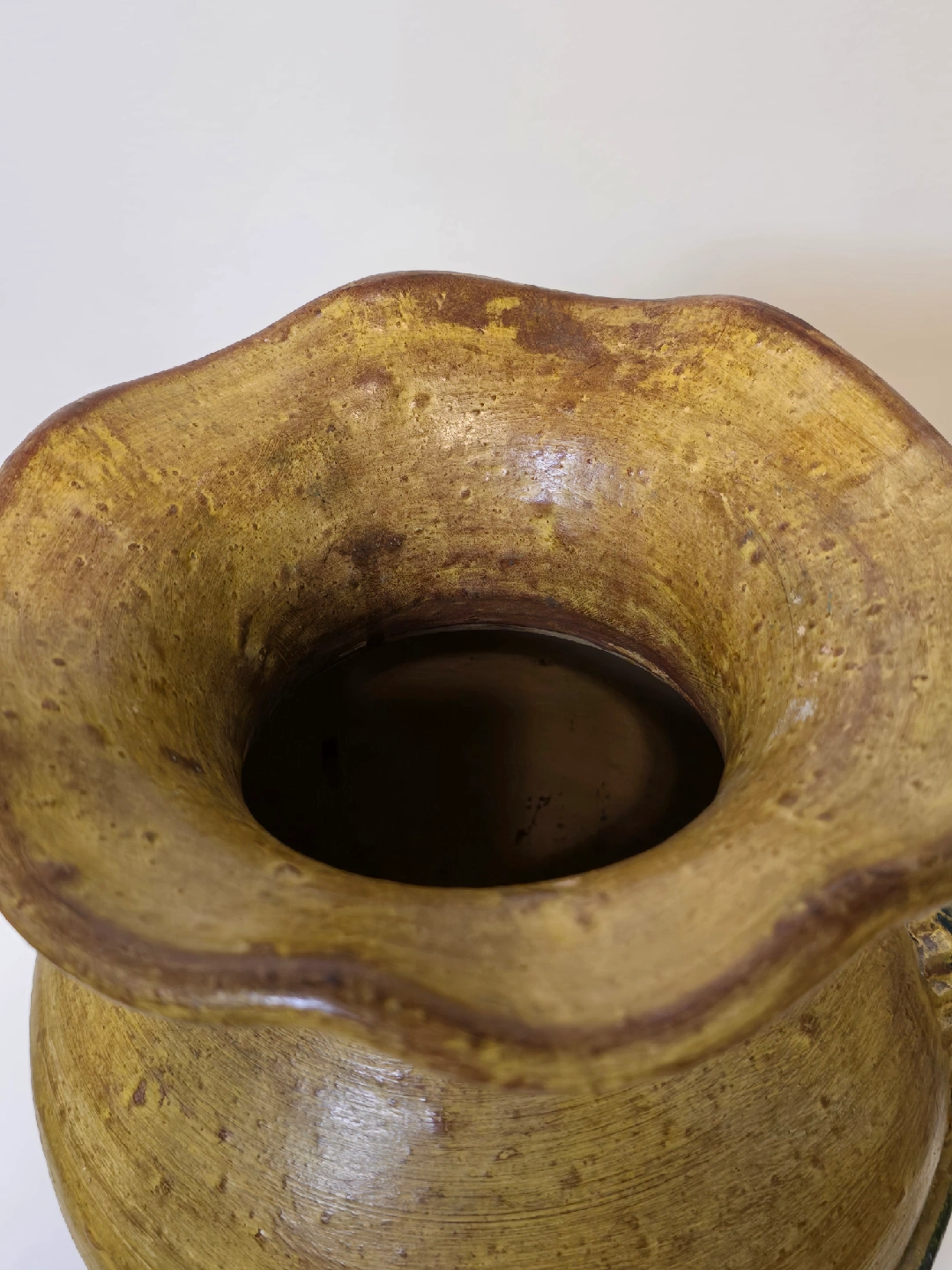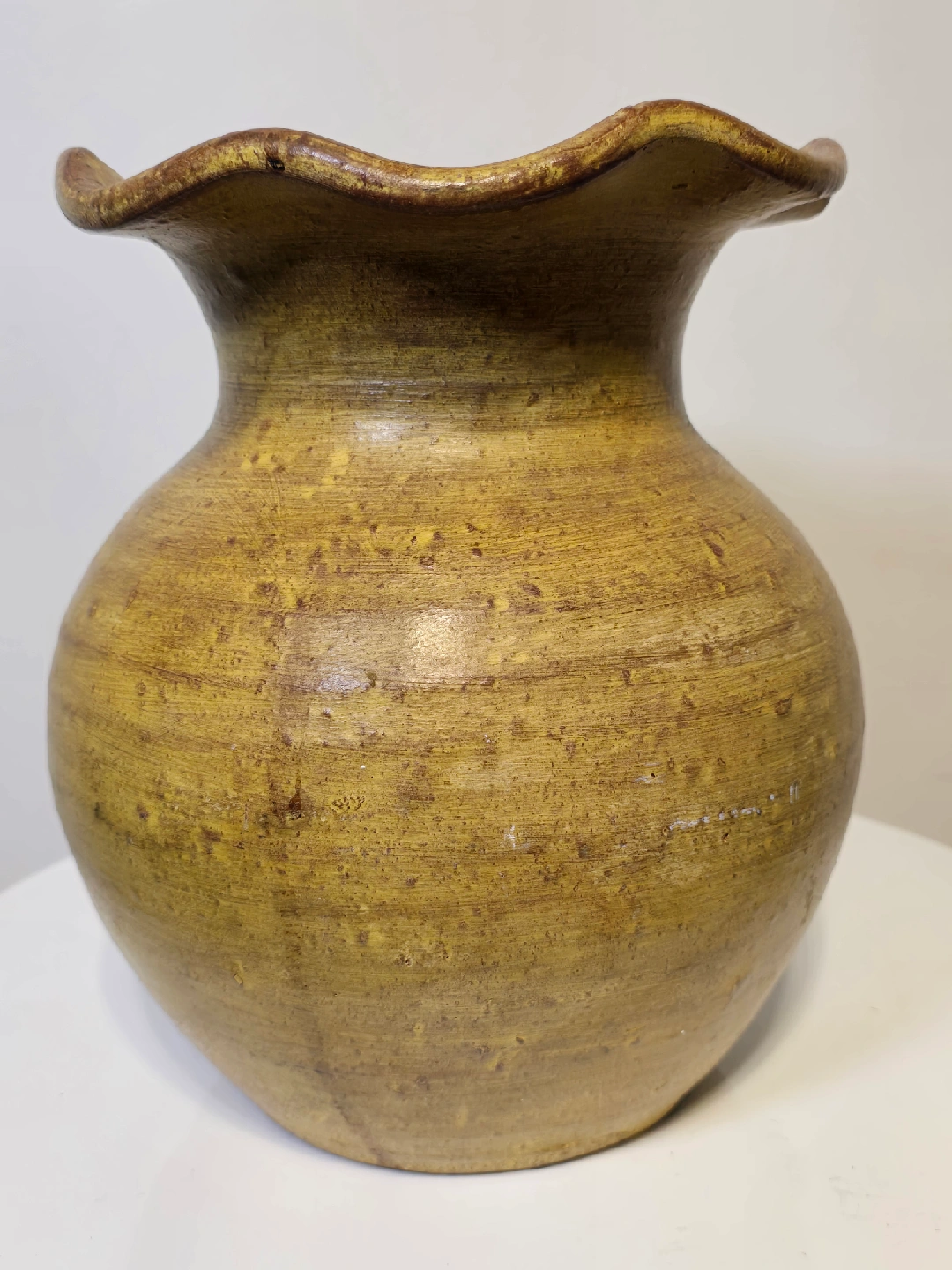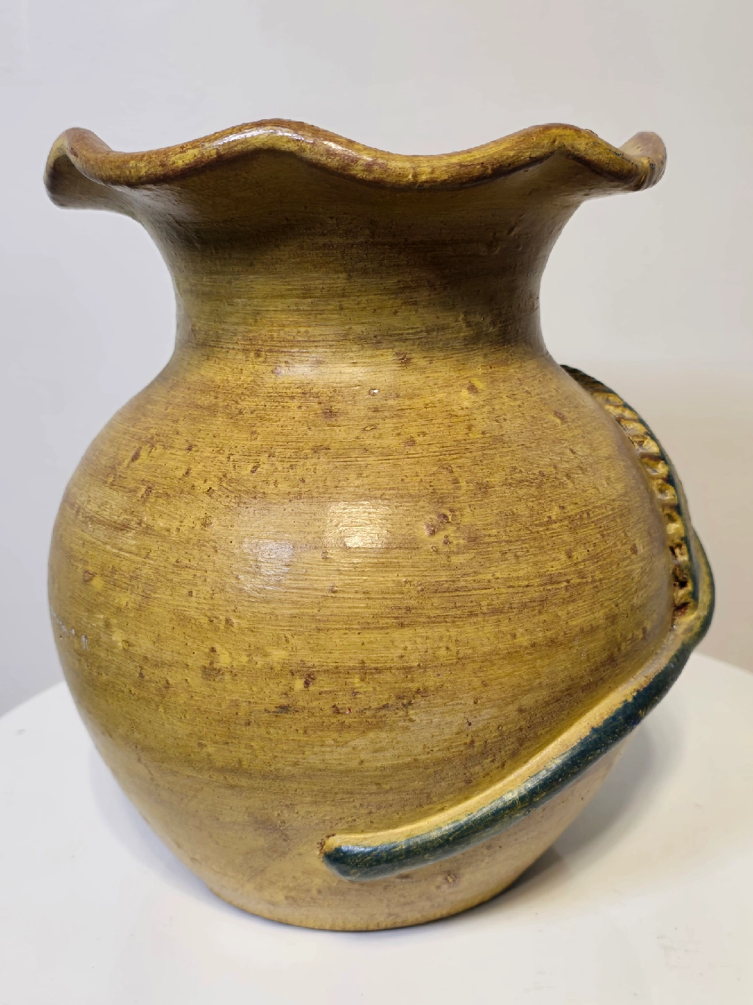This beautiful studio art pottery vase features a unique, handcrafted design with a natural, rustic aesthetic. The vase is made from a beige or tan-colored clay, giving it an earthy and textured finish. A prominent, raised relief motif of a dark blue-green lily pad with detailed veins and seed pods wraps around the front of the vase. The top rim has a distinct ruffled or wavy edge, adding to its organic feel. This piece would make a striking decorative item for a home, adding a touch of natural artistry to any room. It is perfect for displaying dried floral arrangements or as a standalone piece of art. Key features: Type: Pottery vase Material: Ceramic / Stoneware Design: Hand-built, raised relief of a lily pad and seed pods Color: Textured beige/tan with dark blue-green details Style: Rustic, Studio Pottery, Folk Art Condition: Please refer to photos for a detailed view of the condition.