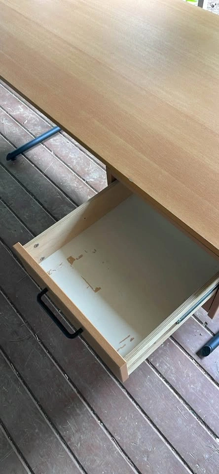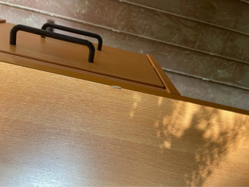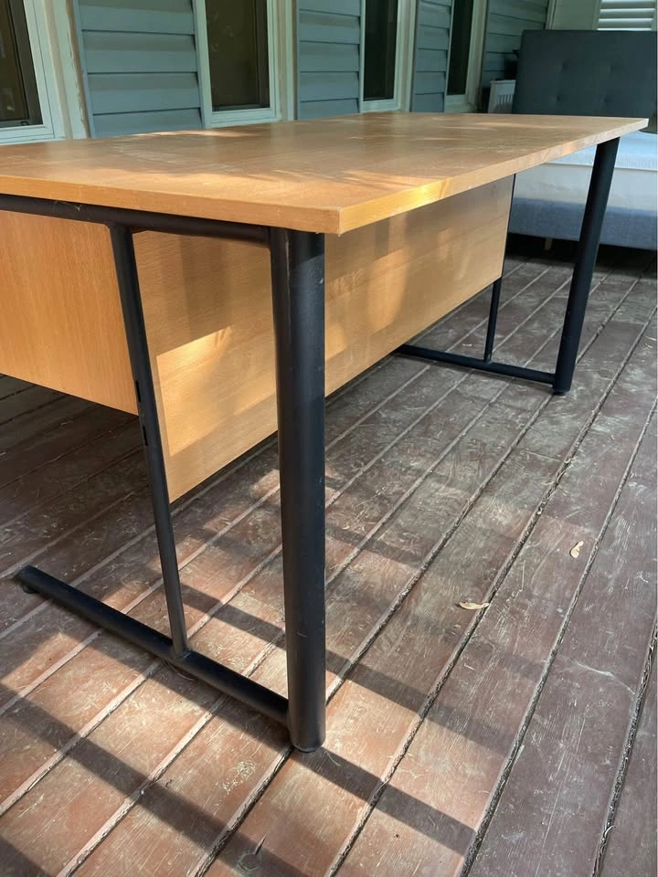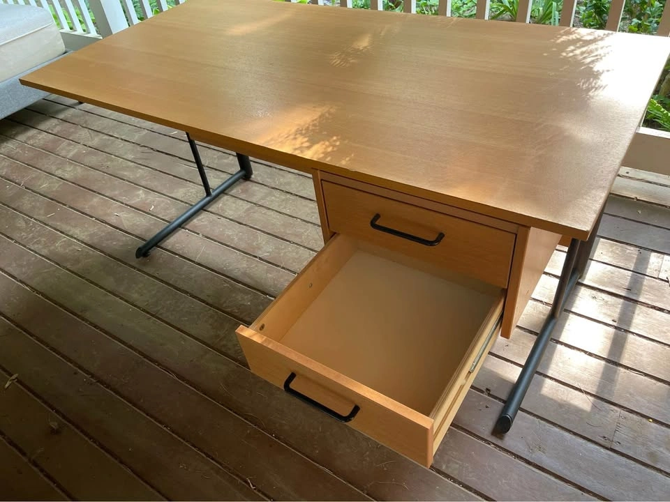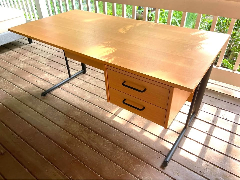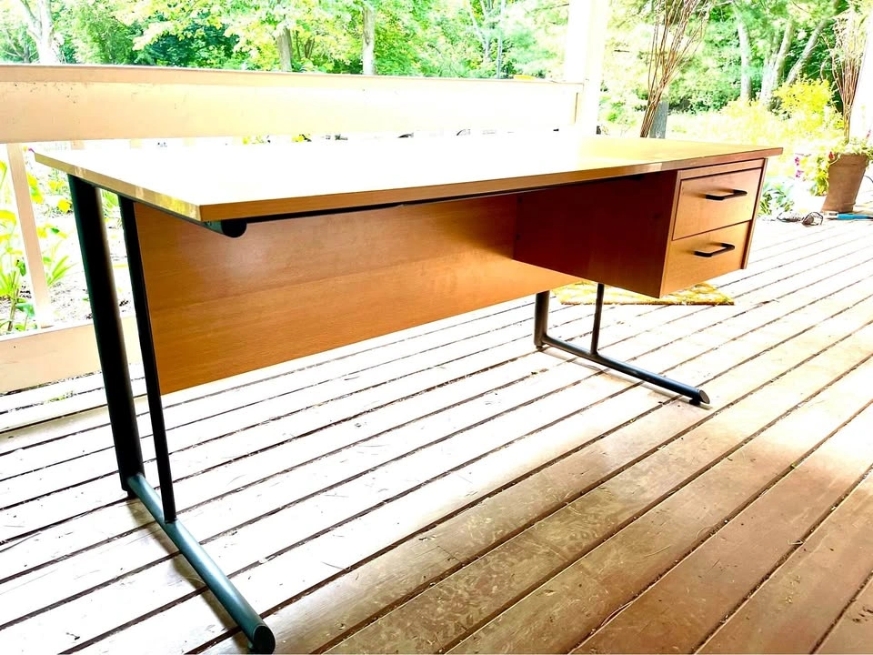 Friso Kramer design mid-century desk with 2 offset right drawers (can be re-configured to the left). Light coloured wood veneer with black metal frame and legs. Dimensions: 59” x 29.5” x 28”high. Privacy wall underneath. In very good condition except for following flaws: 2 small nicks in veneer top and some peeled off coating on the inside of one drawer. Please respond with amount offered, when you can pick up or if you need delivery. Questions beyond “is it available” are welcomed. I am located just outside of Kilbride, ON.