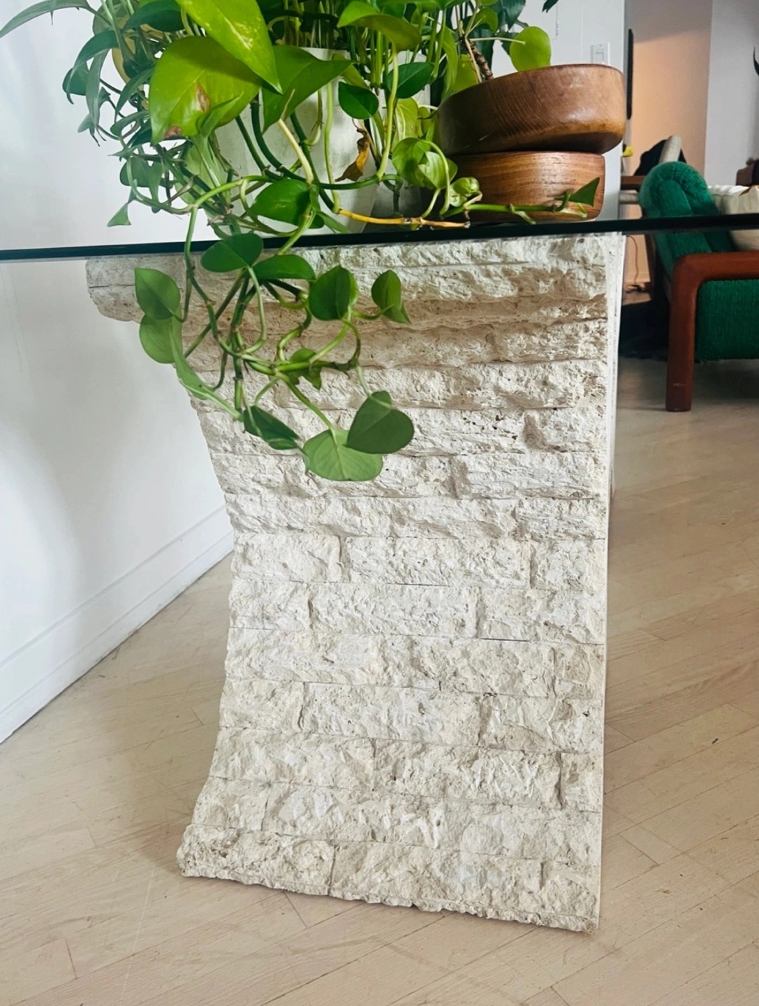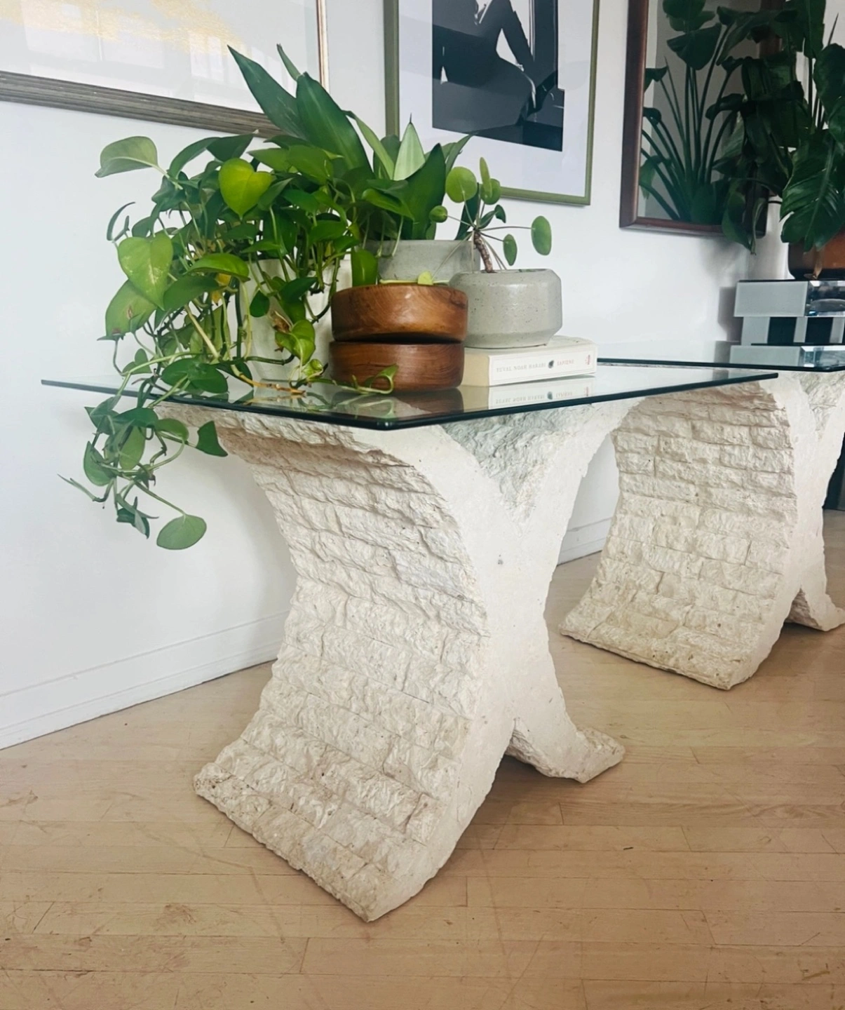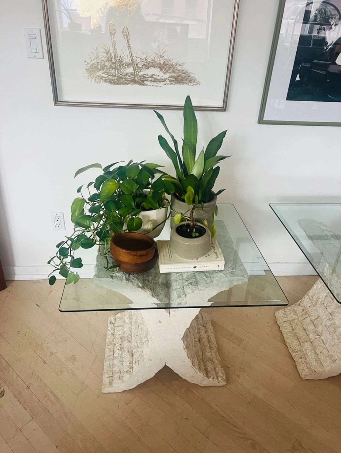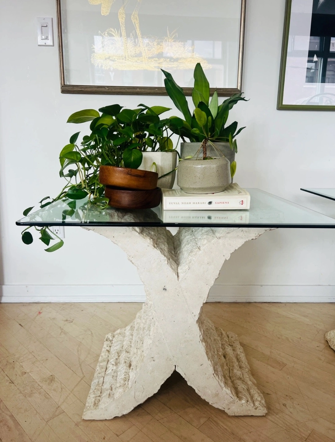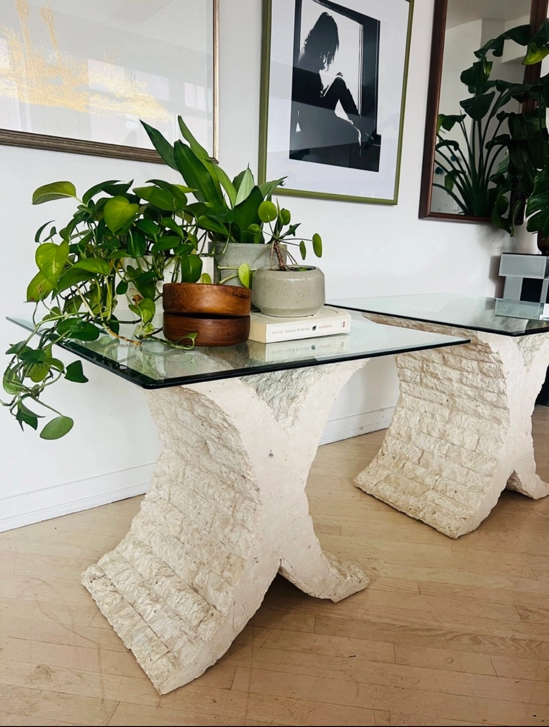 Pair of unique coffee tables with glass tops and white textured bases. Tessellated Stone Side Tables 🌿 GORGEOUS Cream Travertine Heavy tempered glass top with Bevelled edge - A total ‘CB2’ Look Price is for 1 28”x28”x24”h
