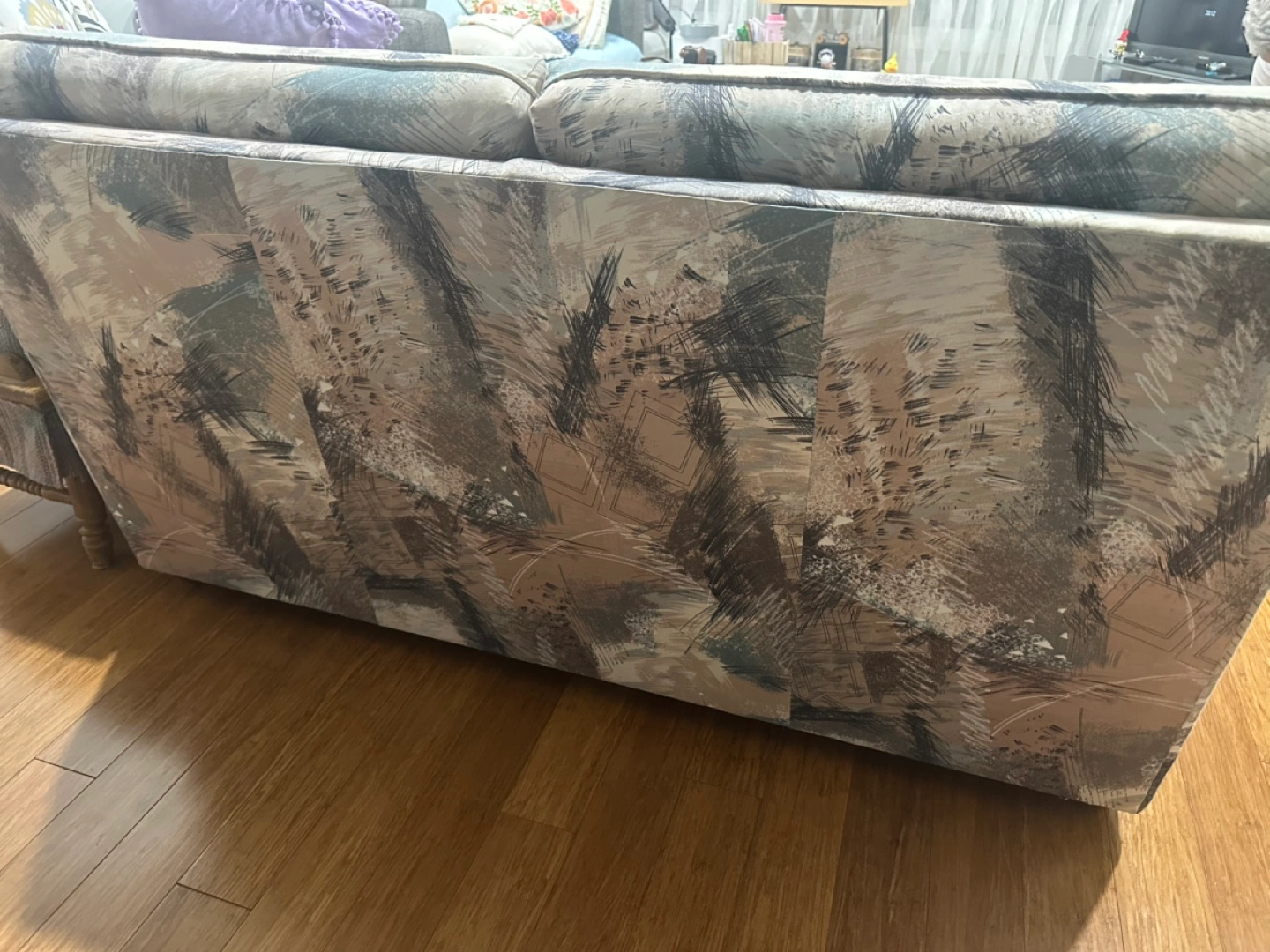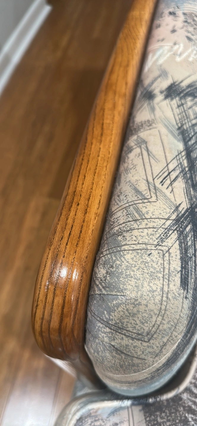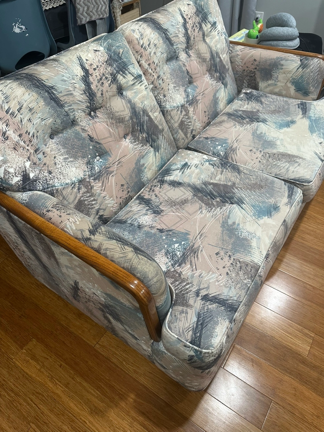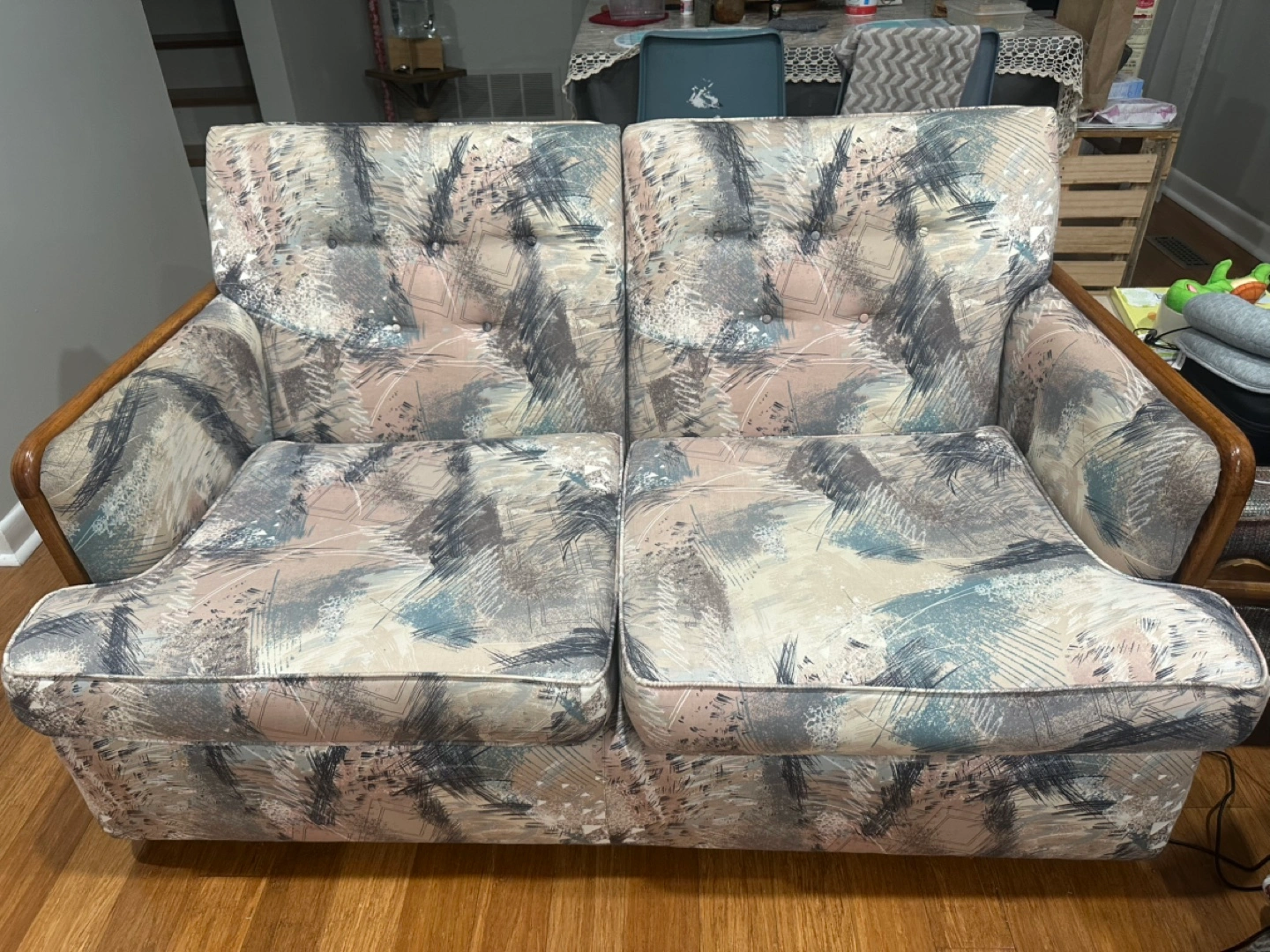 Vintage loveseat. Unique abstract print upholstery. Wooden armrests. Excellent addition to any retro-inspired home. Delivery option is NOT available.