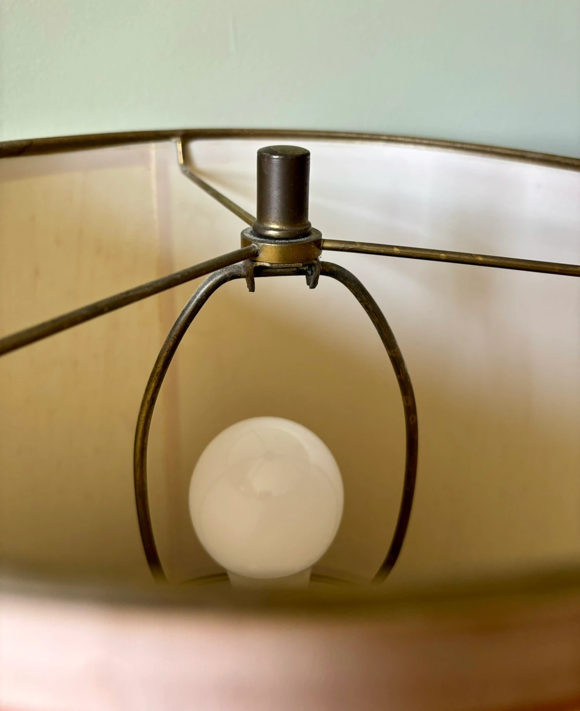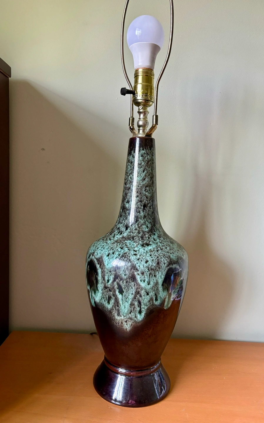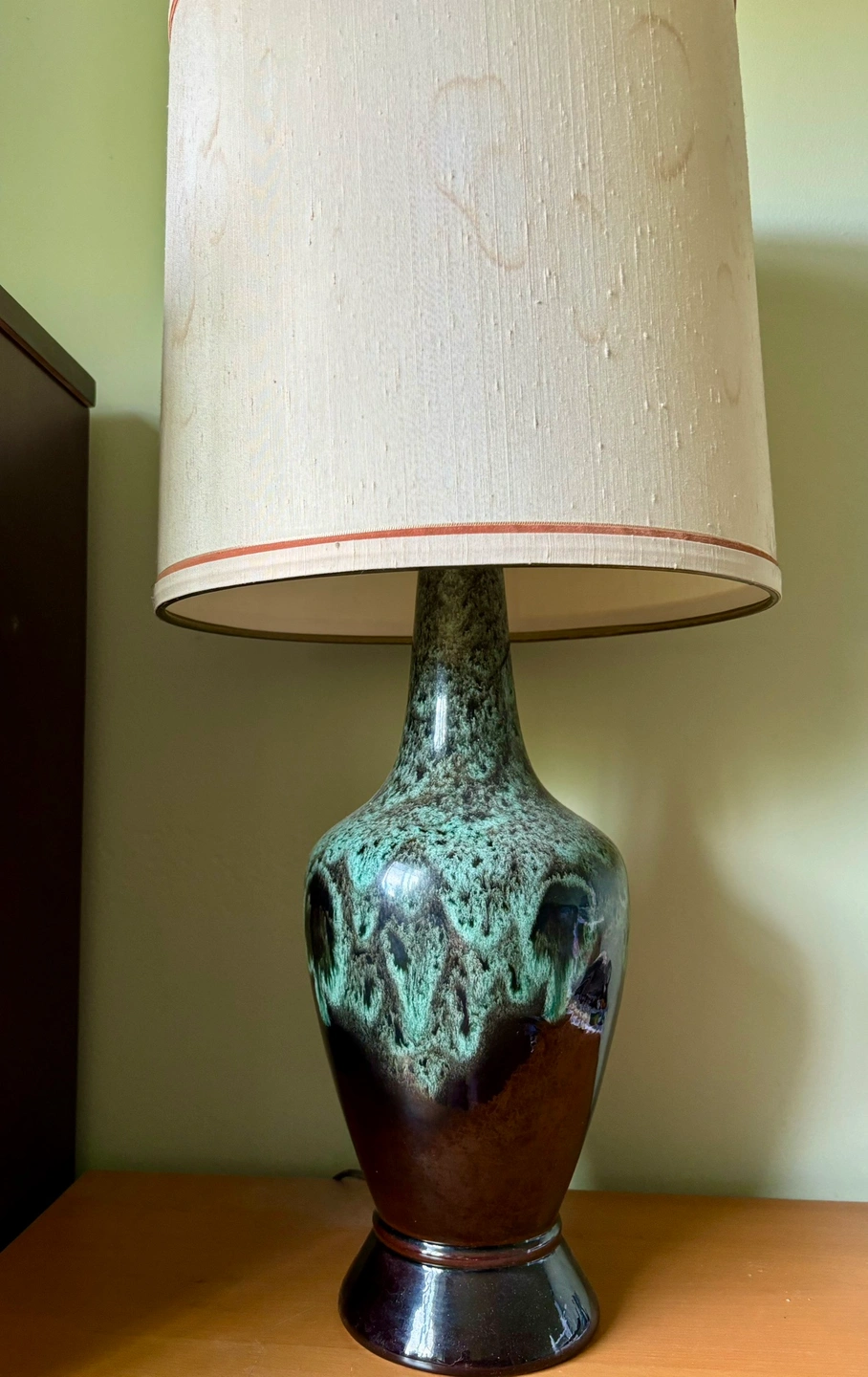 Ceramic coated metal frame table lamp with a green and black glaze. The lamp has a matching shade (some stains on it - you can easily replace it with a new one). The lamp is in very good condition. Length from base to the light bulb 24”. Sell as is. Click on my name for my other listings and pickup locations.