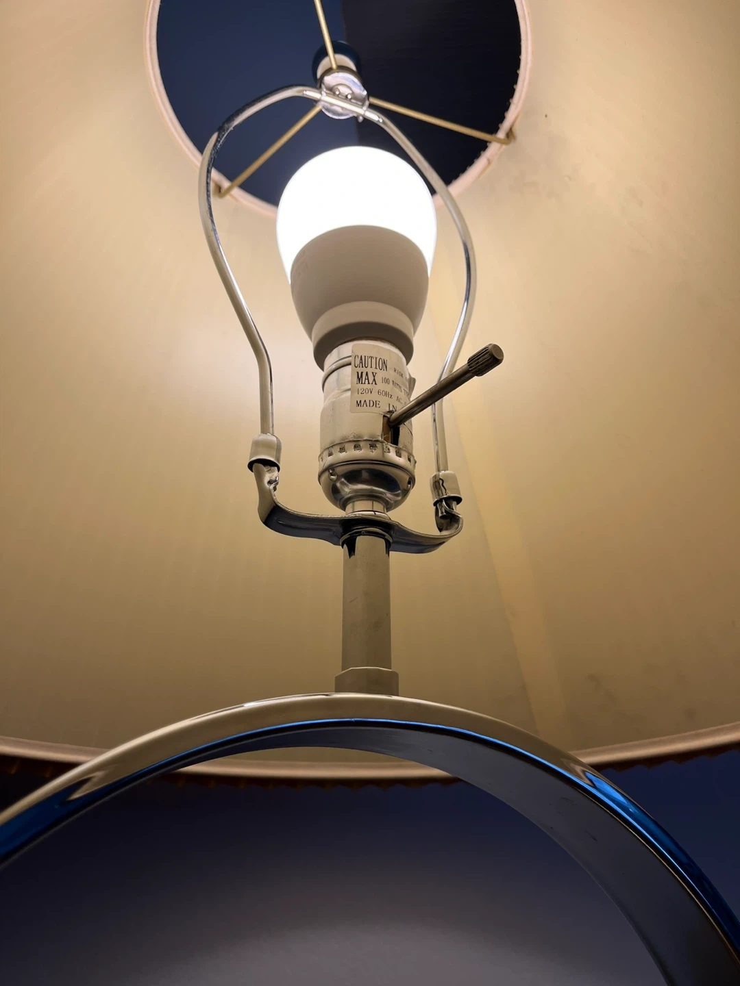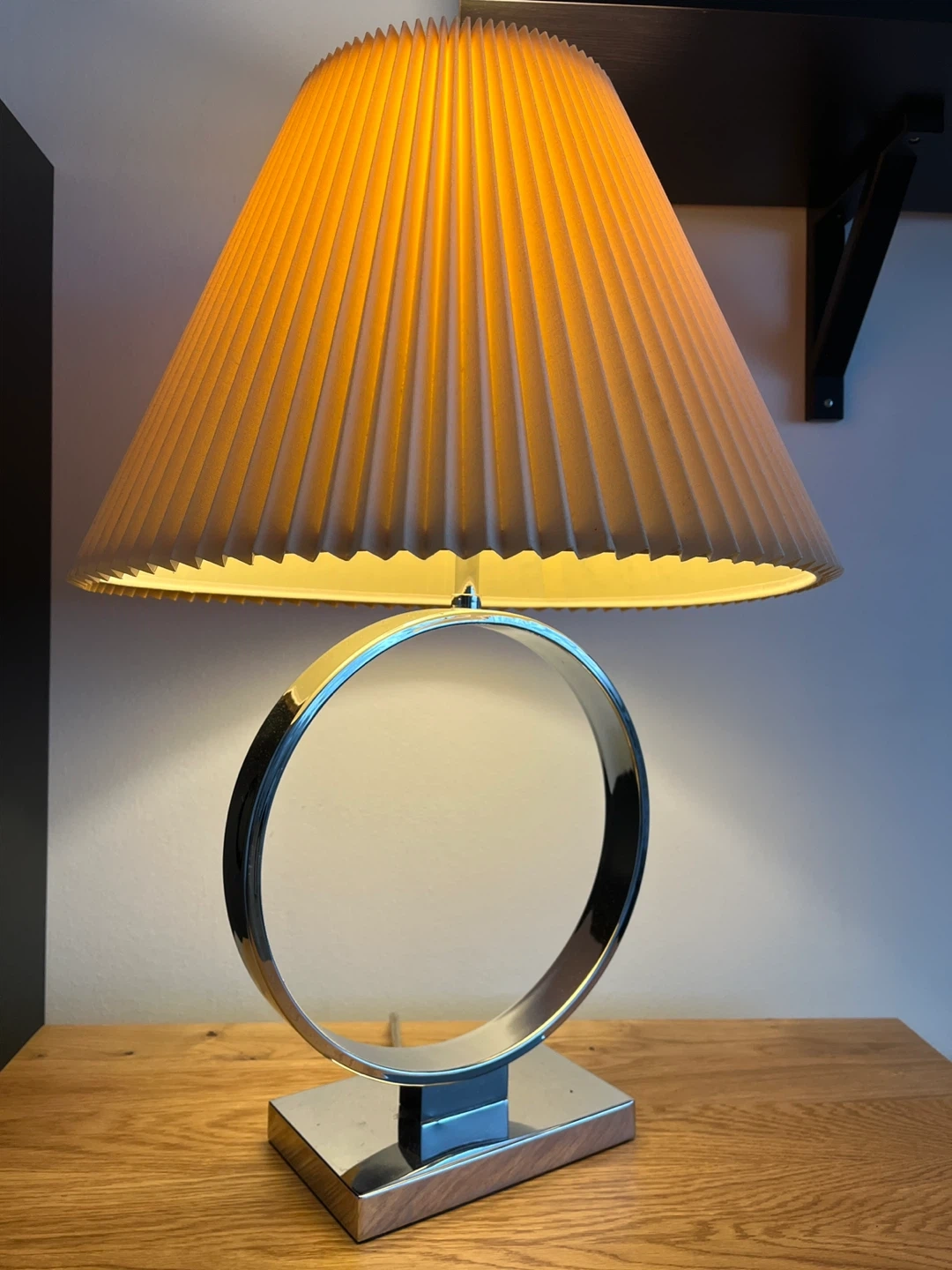 A stylish table lamp featuring a chrome ring base and a pleated lampshade. Height 26 inches. It adds a touch of modern elegance to any room.
