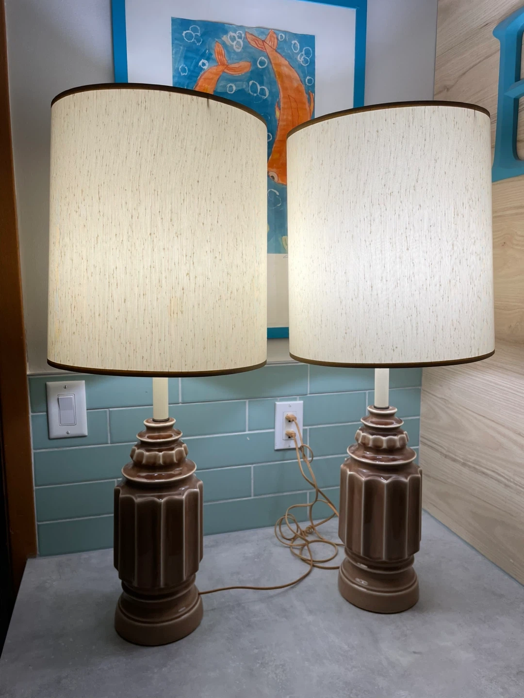 Mid Century (MCM?) Sersha Table Lamps Ad is up = itβs available. π Ceramic bases. $100 for the pair. In outstanding shape, no cracks or chips. A nice soft brown and off white finish. Shades are replacement but period correct as far as I can tell, off white with a light brown satin trim, a near perfect match to the bases! Some discolouration along the seams but less than expected for shades of their vintage. Total height of 33.5 inches including lampshades. Width of shades is 13 inches. Shown with soft white and daylight bulbs, BULBS ARE NOT INCLUDED. $100 OBO. Pick up only. Cash only. No reserves, no trades. First come first served. Low ballers will be politely ignored. Please check out my other listings. Thanks for looking. π