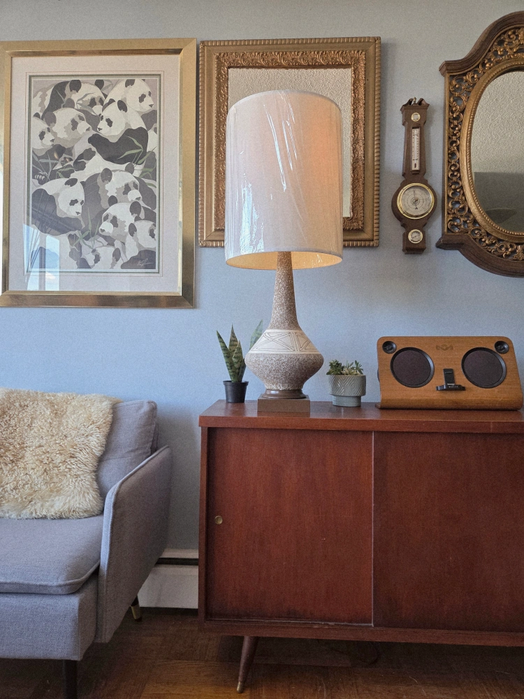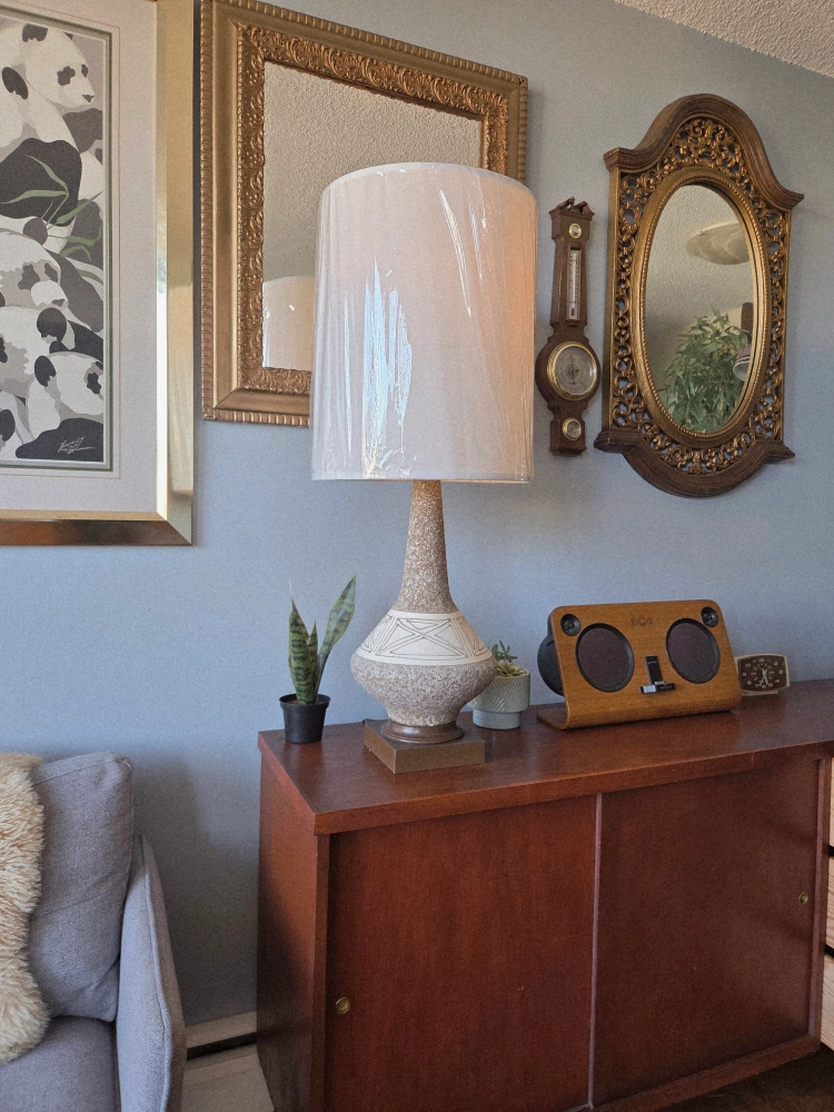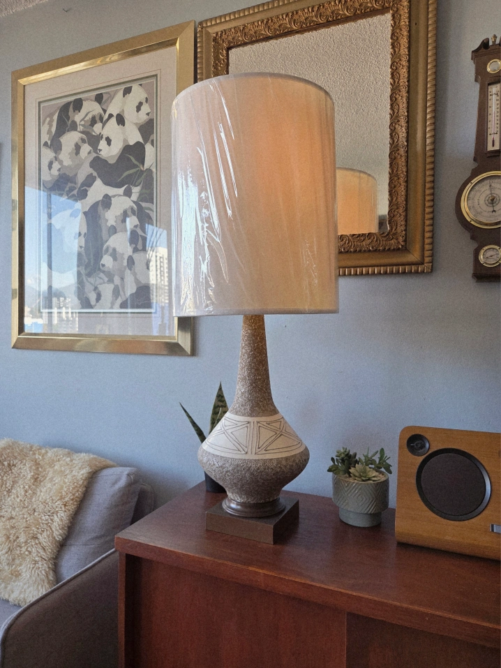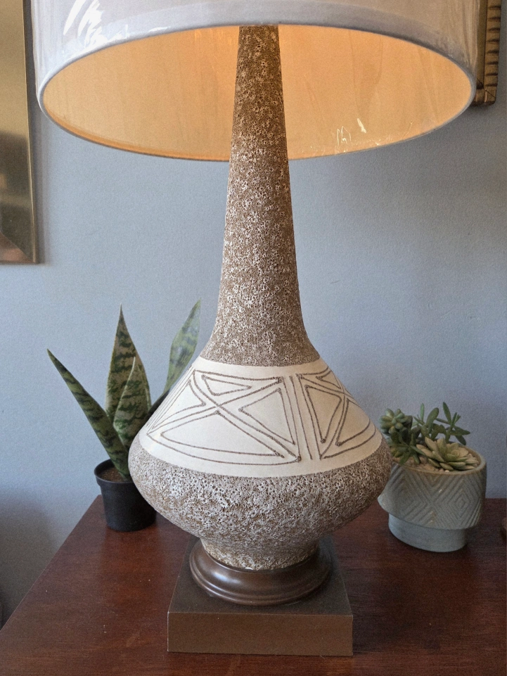 Mid century textured ceramic lamps with a brand new white shade. Price: $95 Dimensions: 38" in height, the diameter of the shade is 15" Pick up in downtown Vancouver or delivery may be arranged for a reasonable fee.