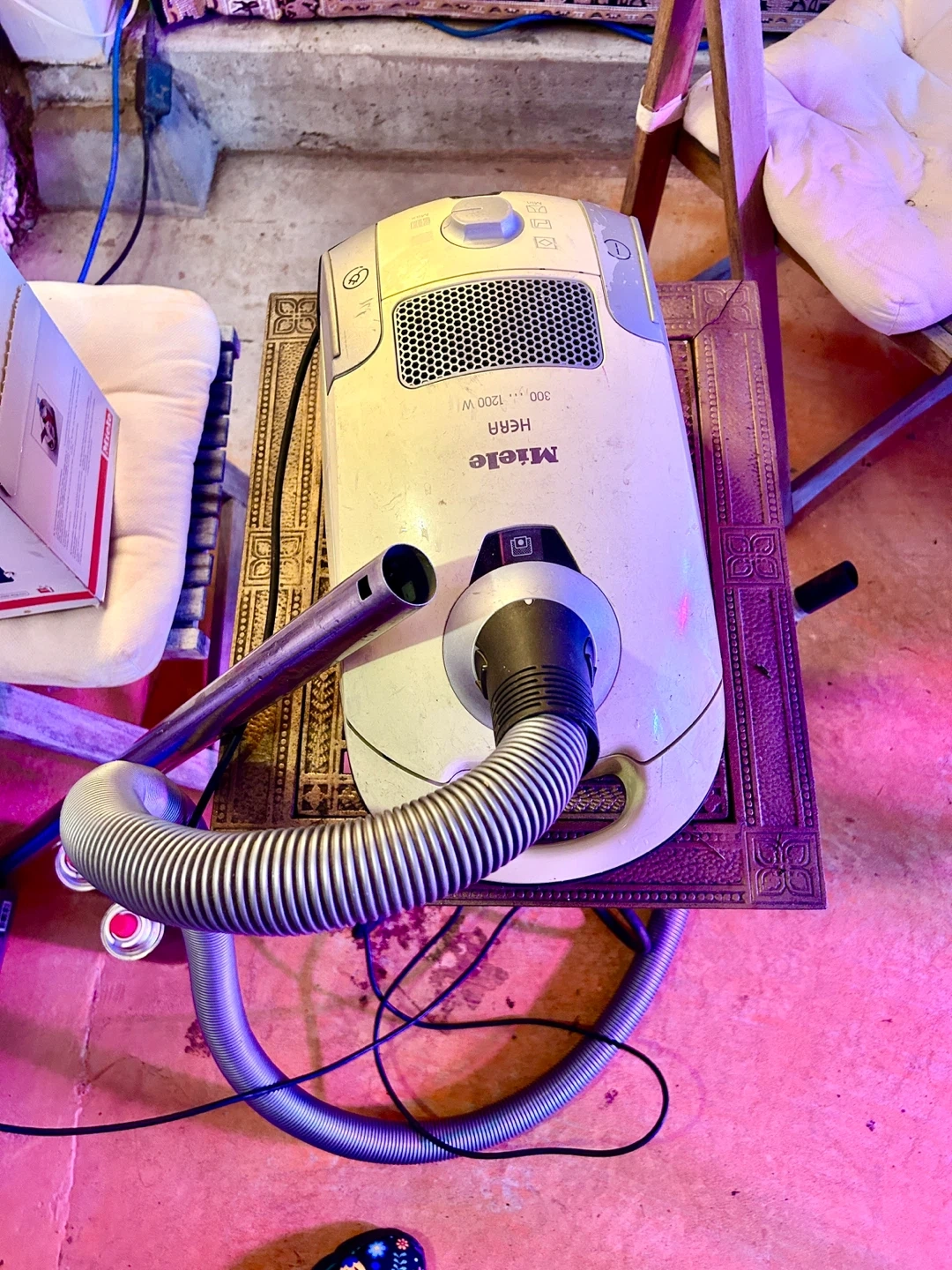 A great, powerful, quiet vacuum cleaner. It comes with a hose and a metal tube and three extra bags and filters. The cord retractor doesn’t work but it could be repaired. 1200 watts of power. Includes an upholstery attachment.