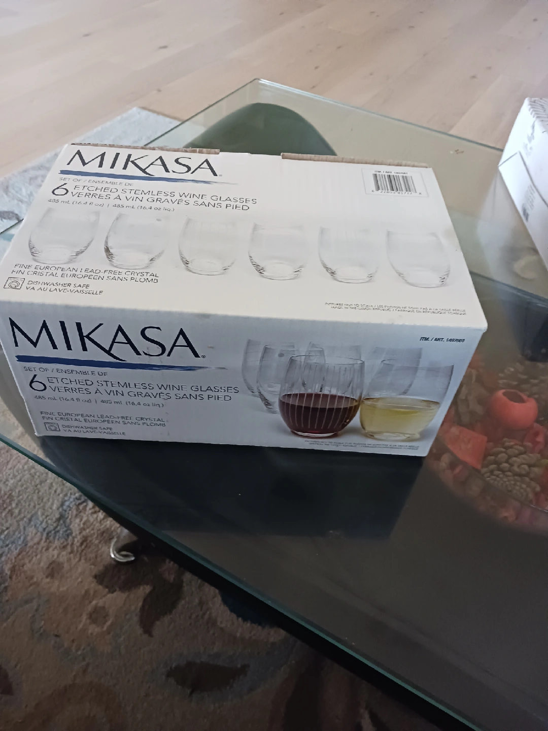 Selling a brand new set of 6 Mikasa etched stemless wine glasses! These glasses are made of fine European lead-free crystal and are dishwasher safe. Perfect for any occasion!