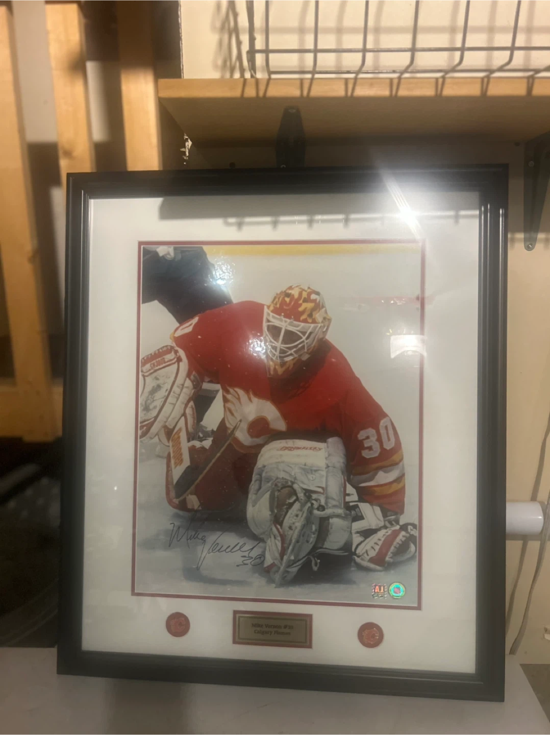 Framed picture of Mike Vernon #30 of the Calgary Flames. Great for any hockey fan!