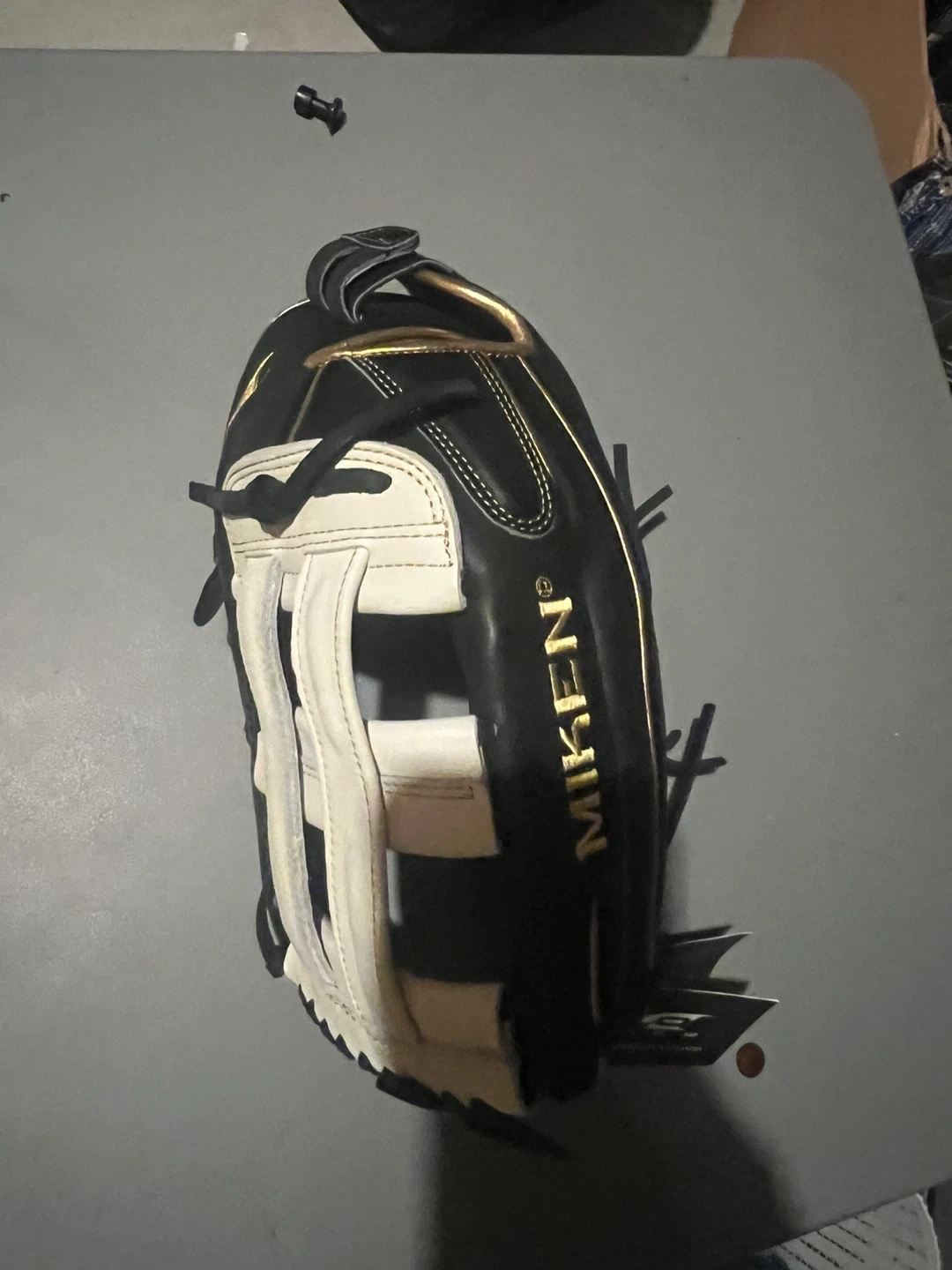Selling a Miken baseball glove in black and white. It's in good condition and ready for the next game!