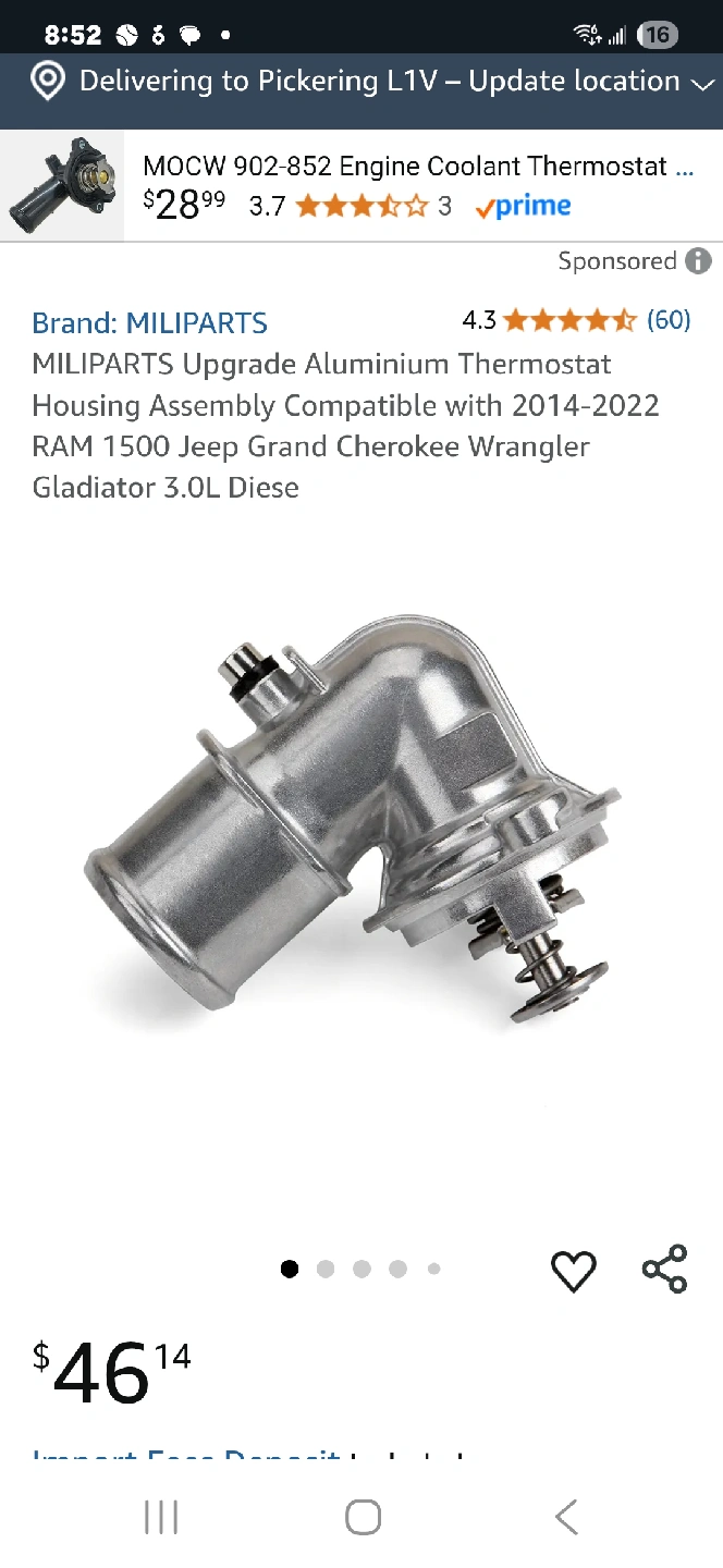 Selling a MILIPARTS upgrade aluminum thermostat housing assembly. It's compatible with 2014-2022 RAM 1500, Jeep Grand Cherokee, Wrangler, and Gladiator 3.0L Diesel models. A great upgrade for your vehicle!