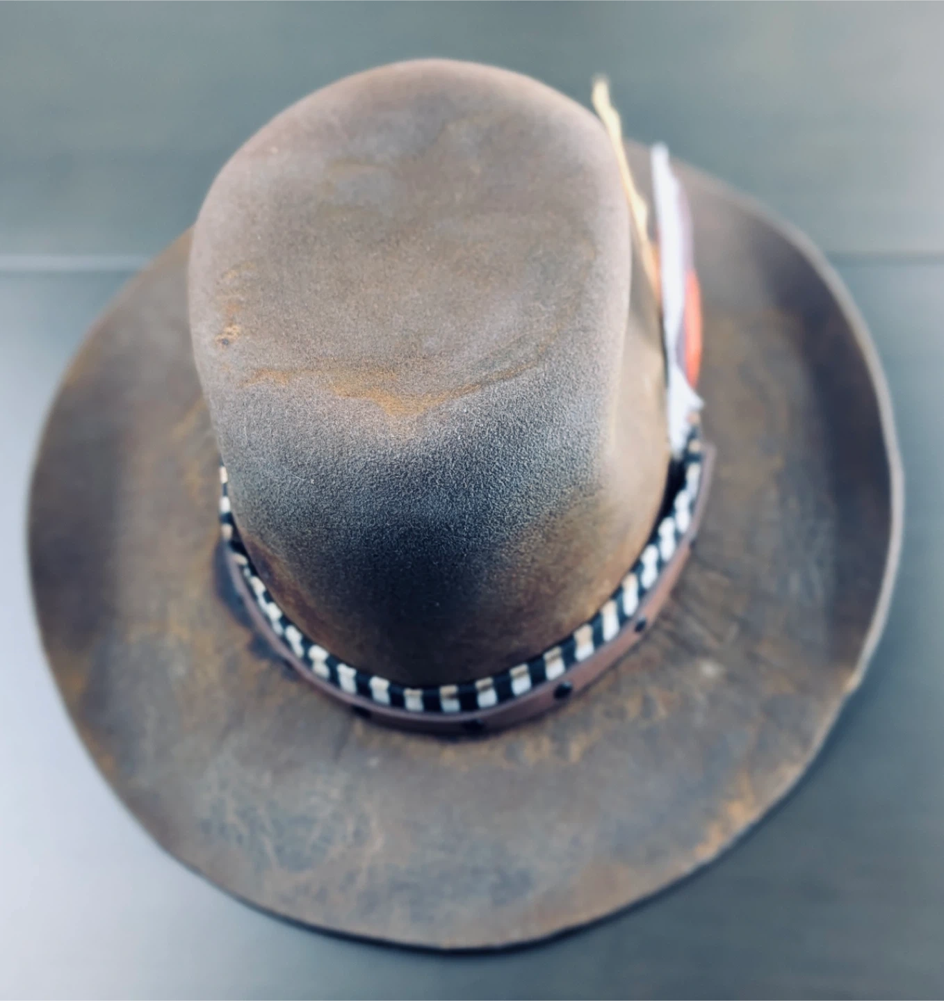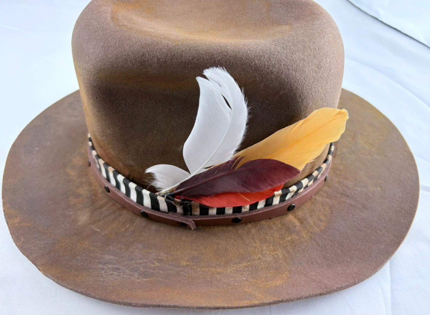 This is a stylish brown fedora from Millard Hats. It's in good condition and features a decorative band and feathers. Perfect for adding a touch of flair to your outfit! Sun burnt looks well used. Burnt from the sun. 100% wool