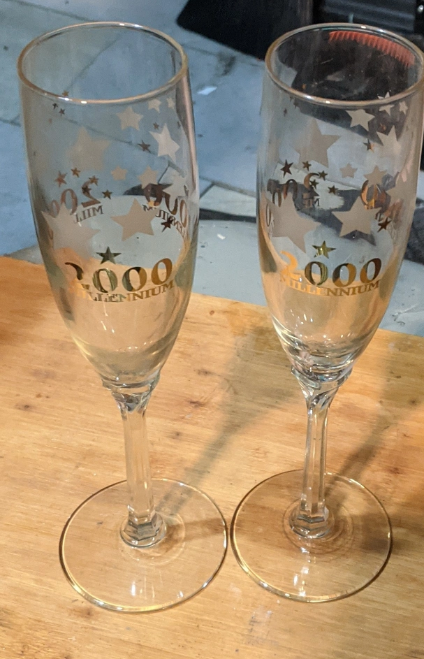 Selling a set of two champagne flutes commemorating the year 2000! These glasses feature a star design and the words '2000 Millennium' etched in gold. Perfect for collectors or anyone looking to add a touch of nostalgia to their celebrations