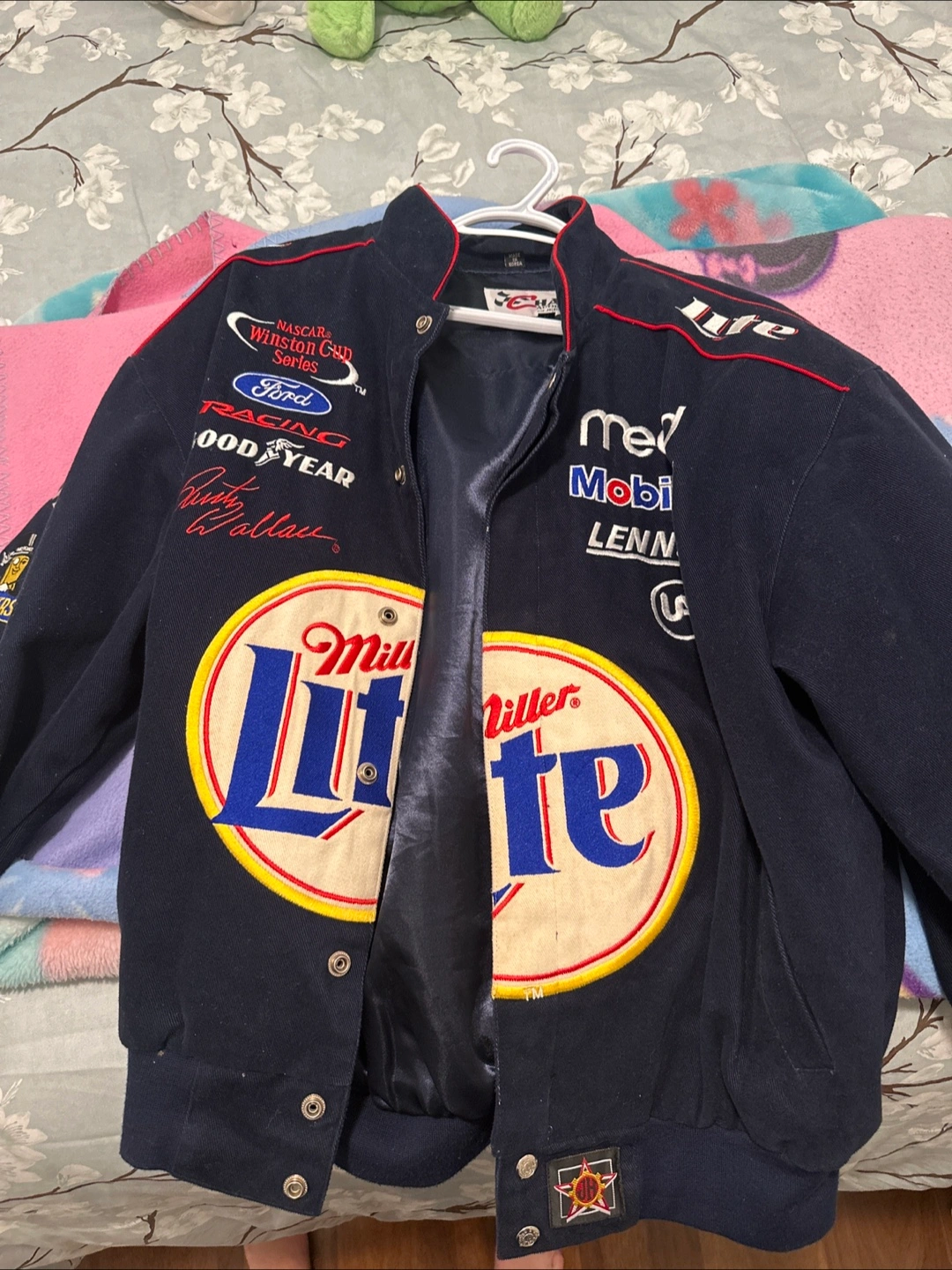 Selling a Miller Lite NASCAR jacket! It's a cool piece for any racing fan or vintage clothing enthusiast. The jacket features the Miller Lite logo prominently displayed, along with various NASCAR and sponsor emblems. A unique and eye-catching addition to your wardrobe!