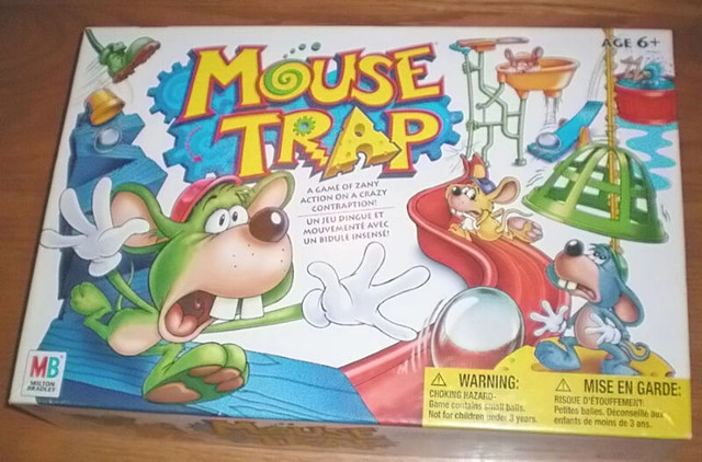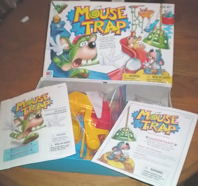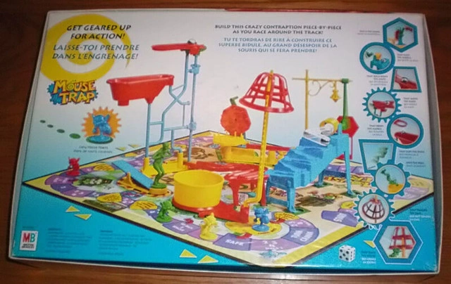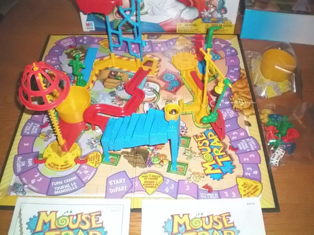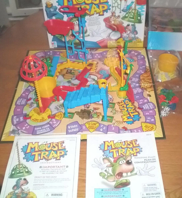 Canadian bilingual version. Includes all parts, game pieces, instruction booklet, assembly booklet, game board sorted in plastic bags. Also includes spare game pieces, cheese pieces, bowl for cheese, diver, dice and ball bearing marbles. Box and game board are in as new condition. Tested and in working order. Get yourself a great deal on a classic board game that is fun for the whole family, Only pay half of retail and get extra pcs.