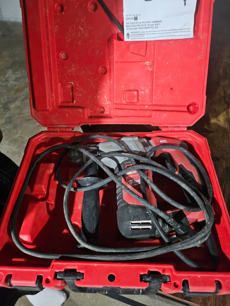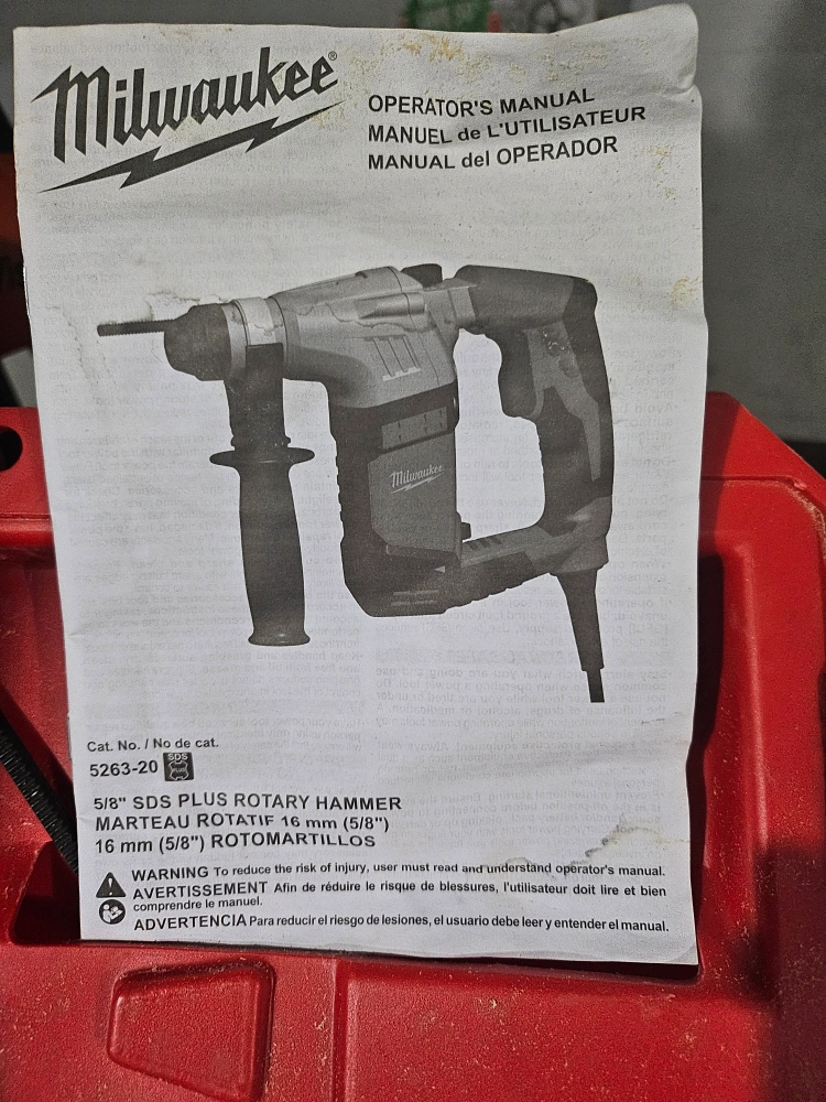 Selling a Milwaukee 5/8" SDS Plus Rotary Hammer. It comes with the operator's manual and the original red case. Great for tackling tough jobs around the house or on the worksite! ** pet friendly home