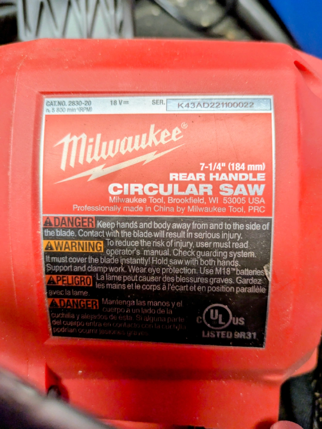 Selling a Milwaukee 7-1/4" (184 mm) Rear Handle Circular Saw. It's in used condition, but still works great! This saw is perfect for professionally made cuts. Please be aware of the safety warnings on the tool before use