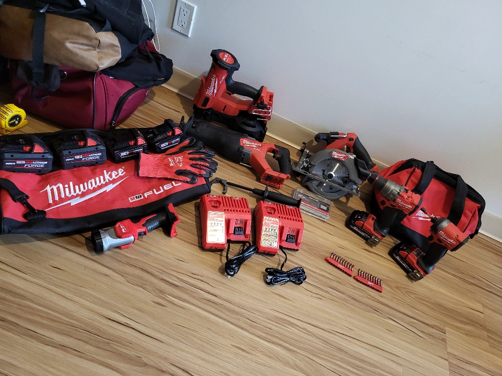 Selling a Milwaukee M18 FUEL power tool set. This set includes a variety of tools, batteries, and chargers, all in the signature Milwaukee red and black. Great for any job site or DIY project!