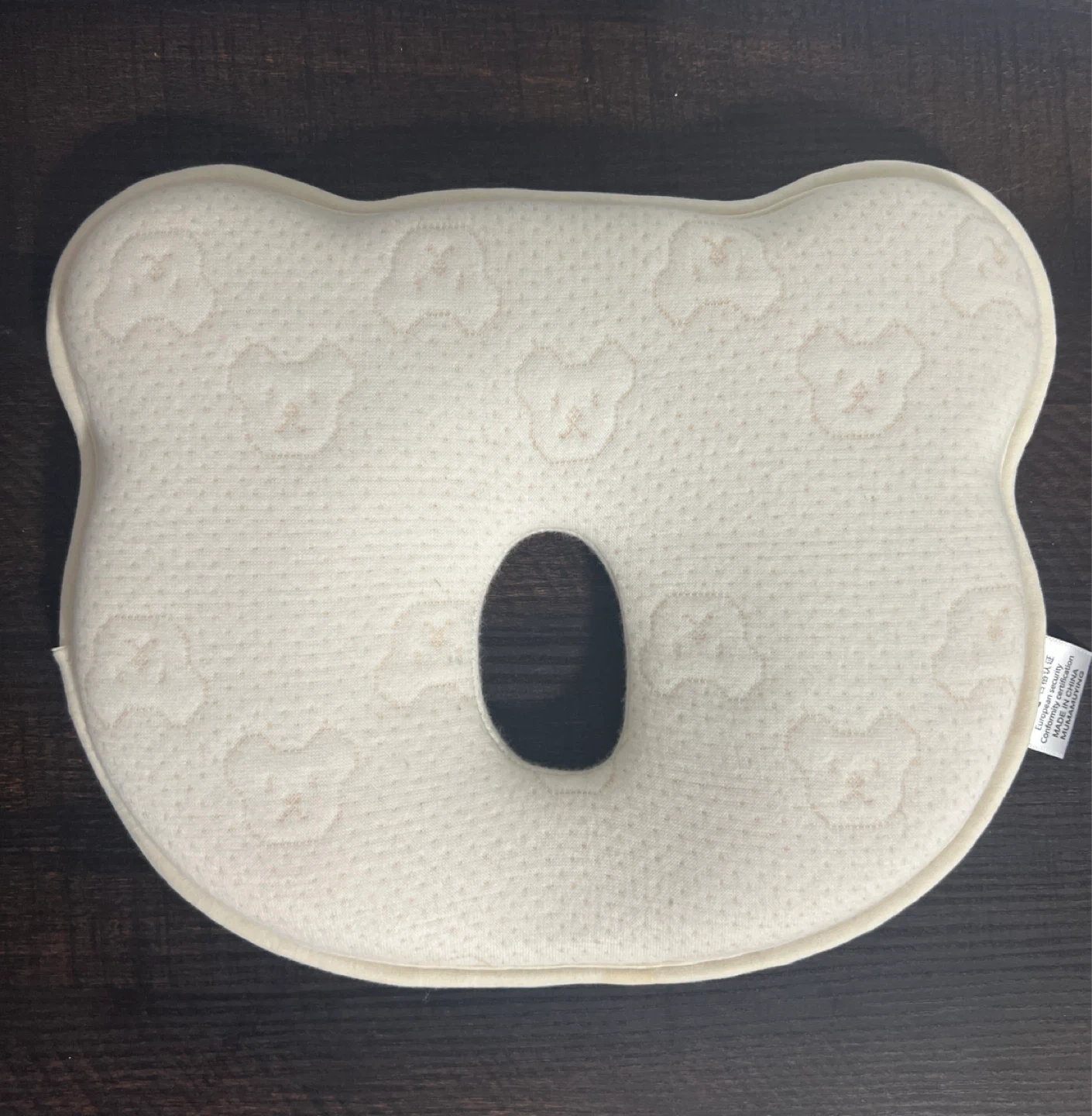 This is a MIMAMUM baby head shaping pillow. It's designed to help prevent flat head syndrome in infants. Features a cute bear pattern on a soft, breathable fabric.