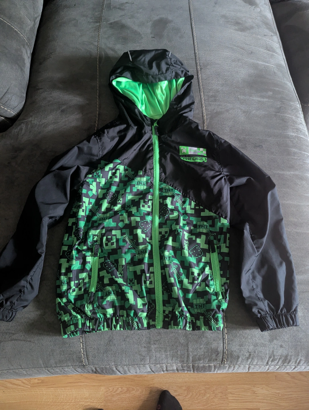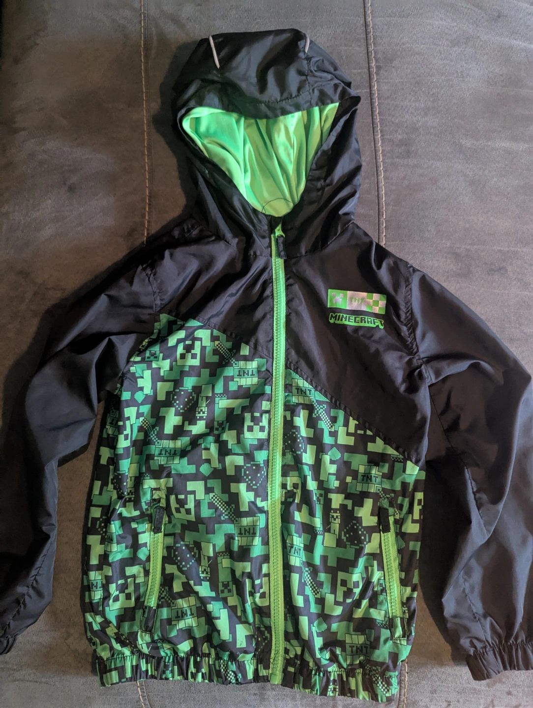 Lightweight, zip-up jacket. Features Minecraft design. Green and black colour scheme. Good for layering. Size medium Boys