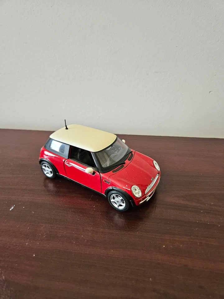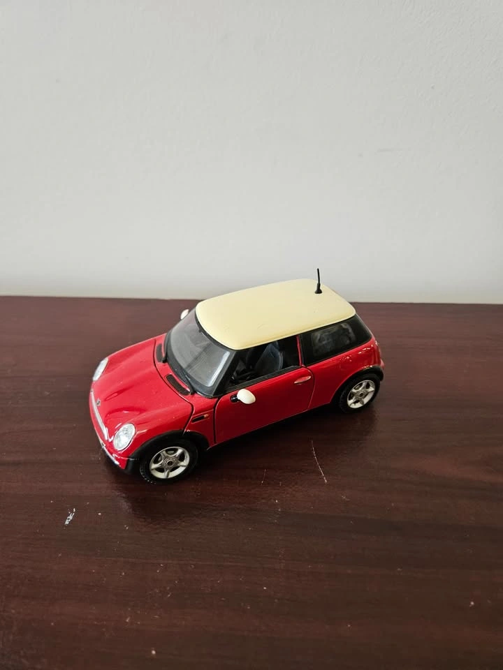 A cheerful Maisto 1:24 Mini Cooper die-cast model in red with a contrasting white roof. Classic and compact, this Mini brings a touch of British charm to your collection. Nicely detailed with opening doors and rolling wheels. Brand: Maisto Model: Mini Cooper Scale: 1:24
