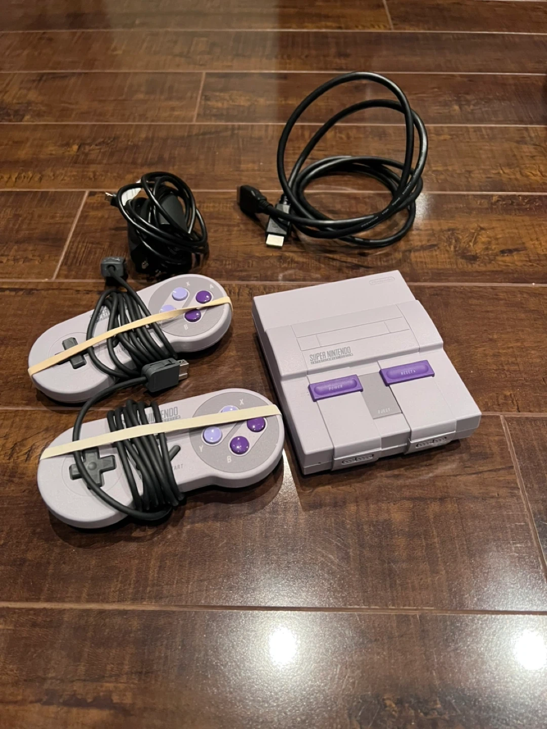 Selling a Super Nintendo SNES console. Includes two controllers and the necessary cables to get you gaming. Great for reliving some classic retro games!