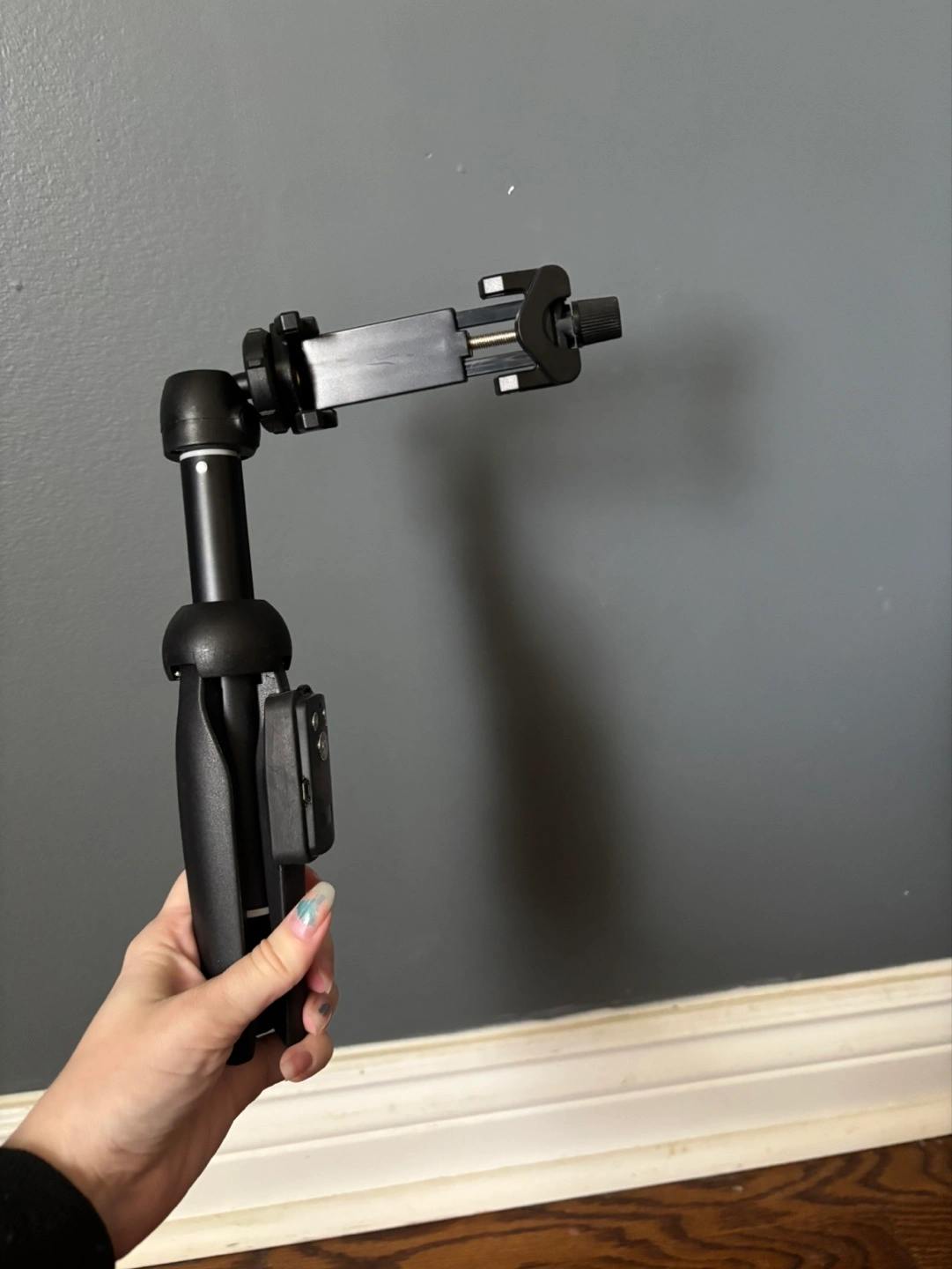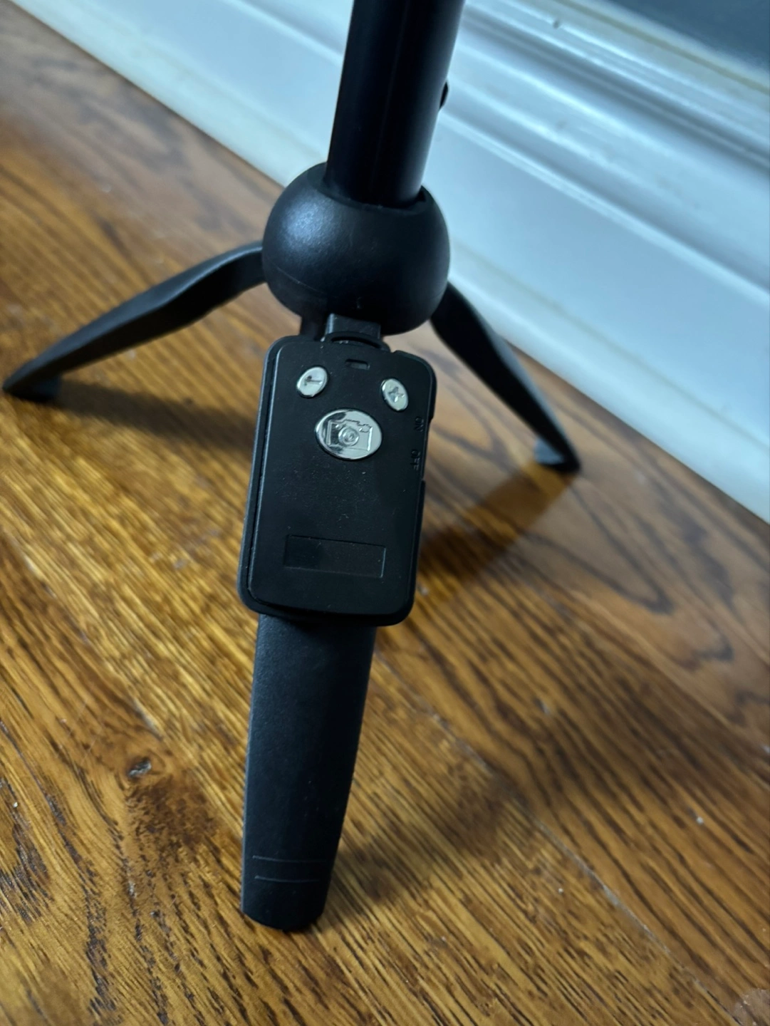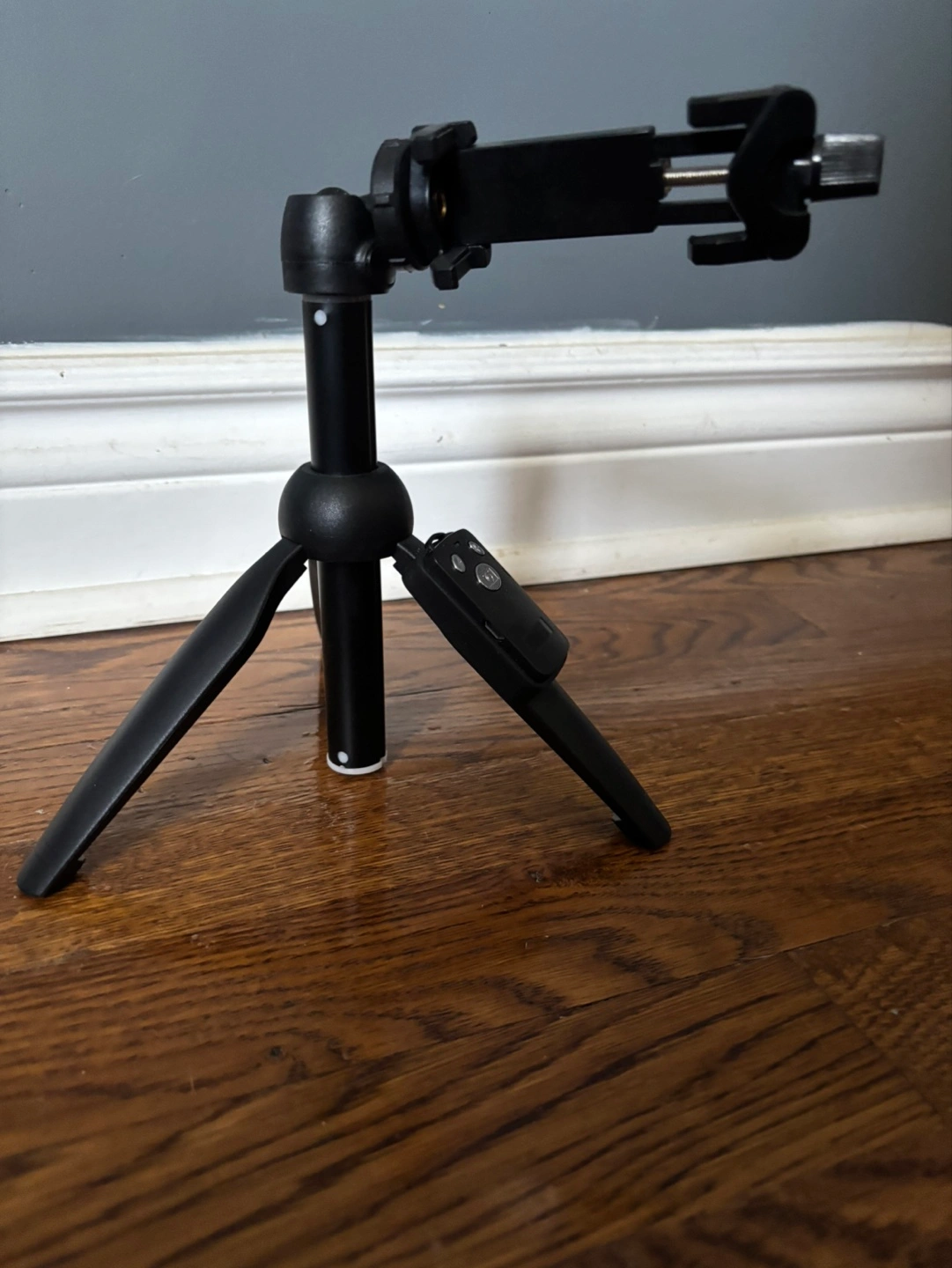 Portable tripod stand, perfect for selfies or vlogging. Features adjustable phone holder and Bluetooth remote. Compact and lightweight design.