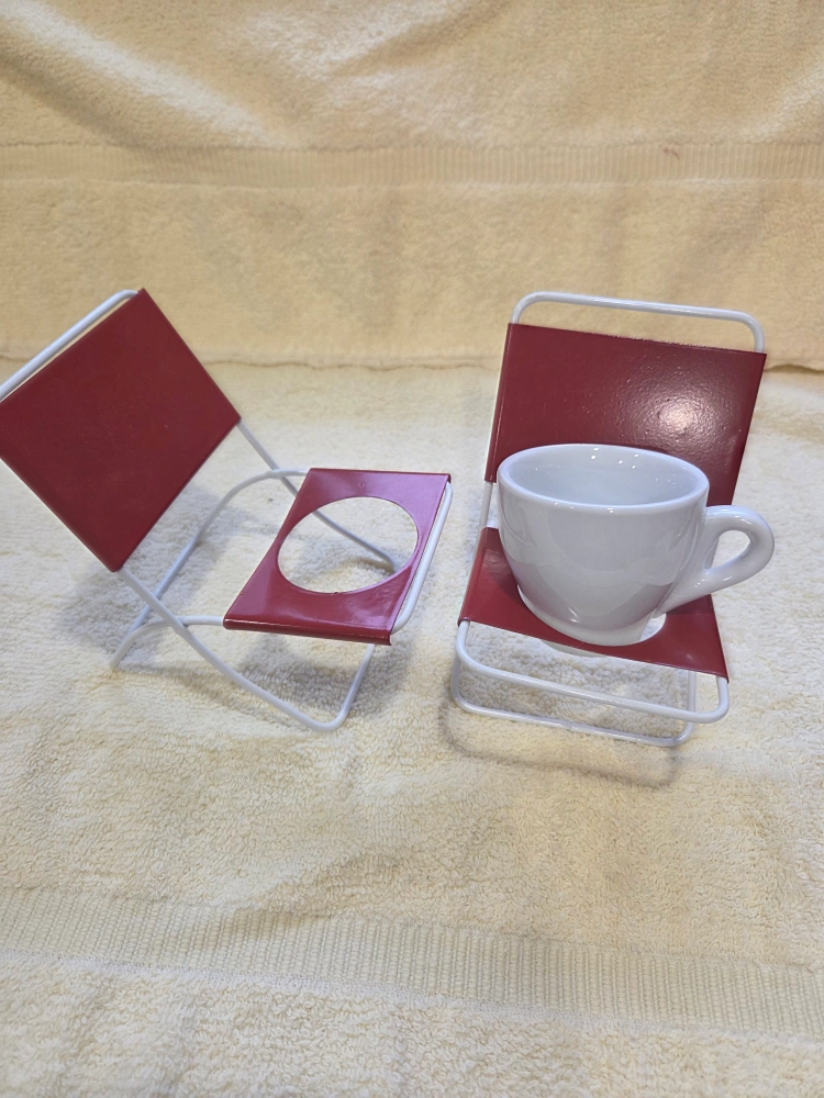 These adorable miniature beach chair espresso cup holders are perfect for adding a touch of fun to your desk or coffee table! They're red and white and in great condition.
