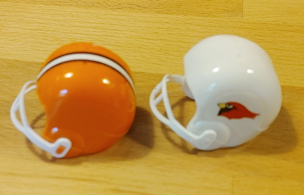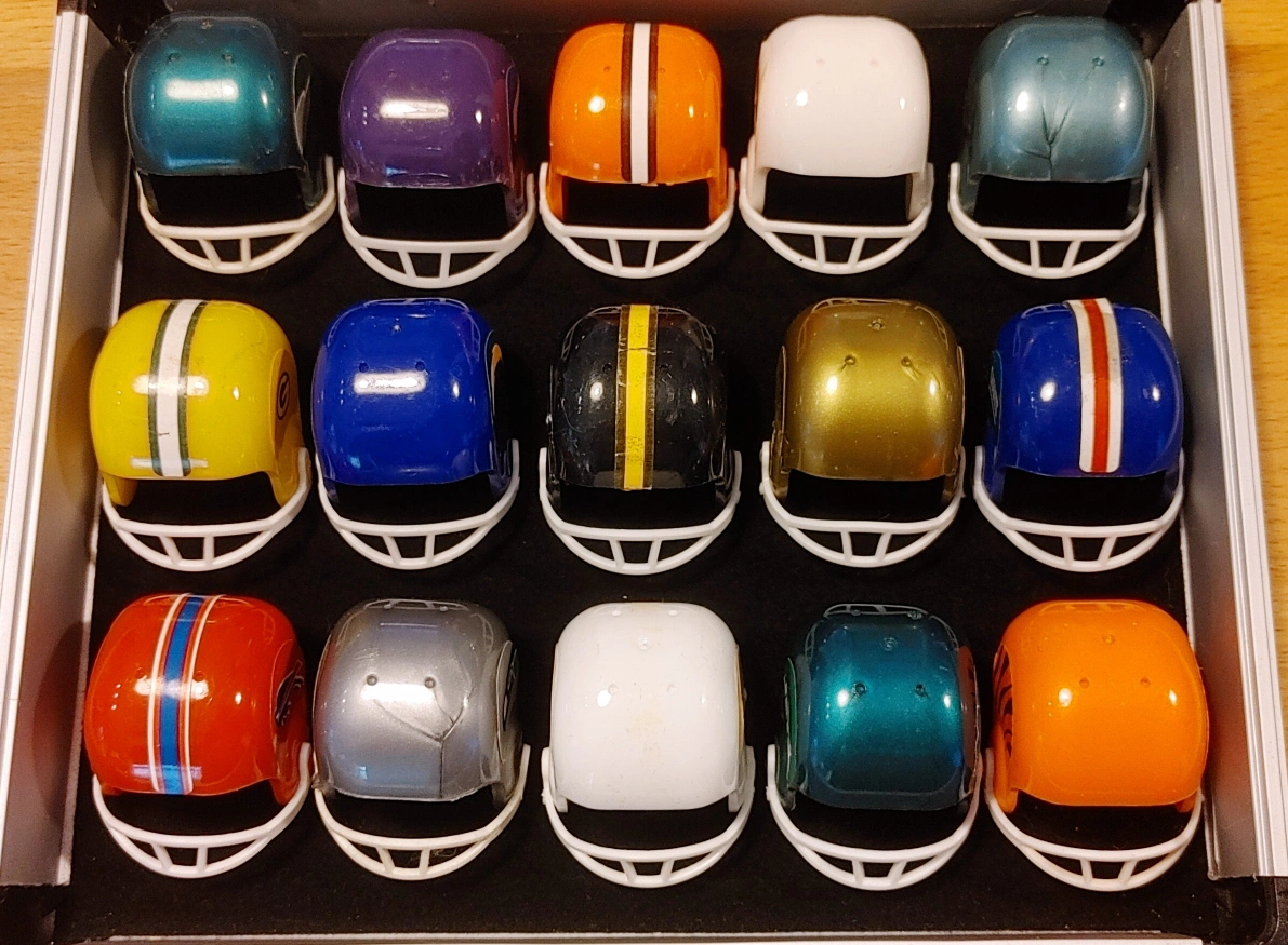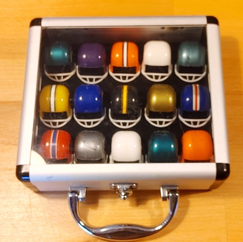 1980's miniature NFL football helmets. There are multiple teams represented, including the Green Bay Packers, New England Patriots, Buffalo Bills, and Seattle Seahawks. 15 helmets in total with case. All helmets in good condition. Smoke free home pick up Mt.Brydges cash only. Not selling individually.