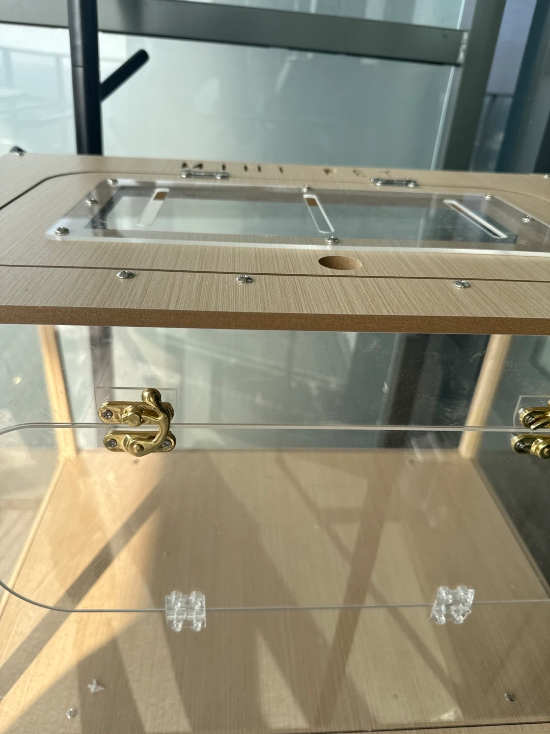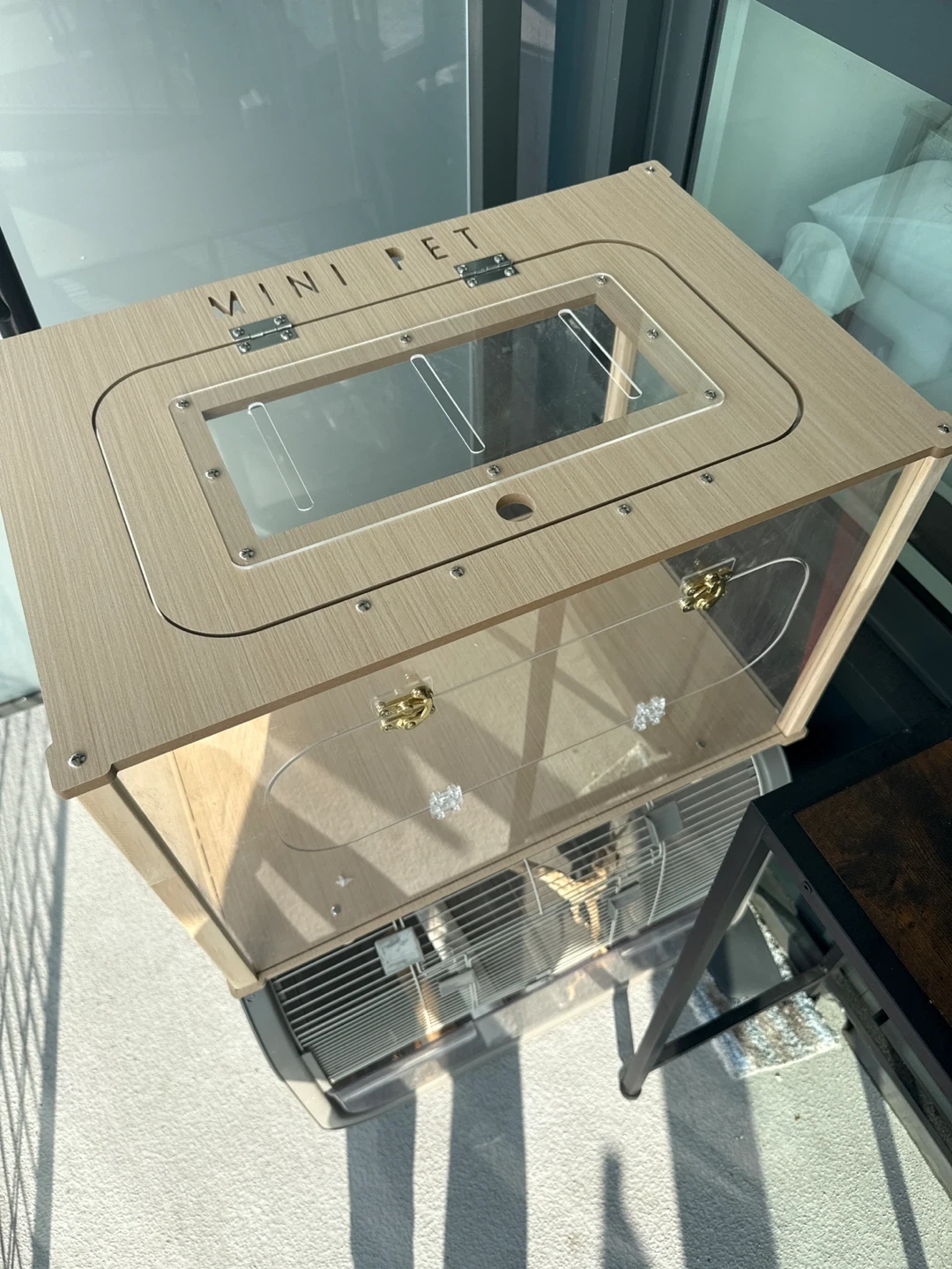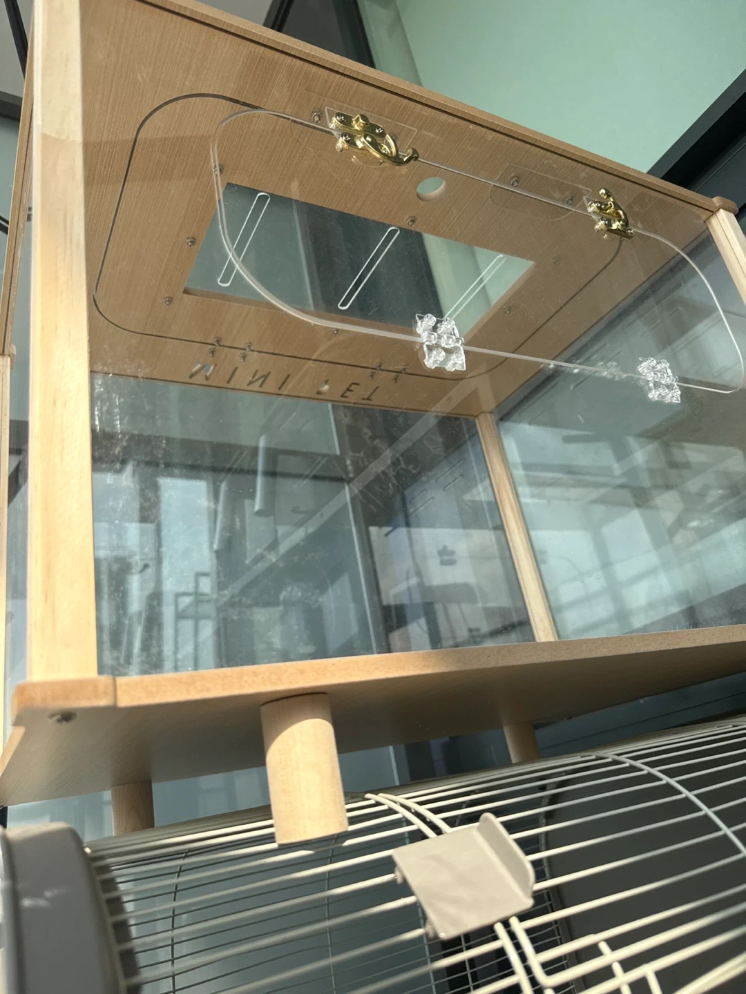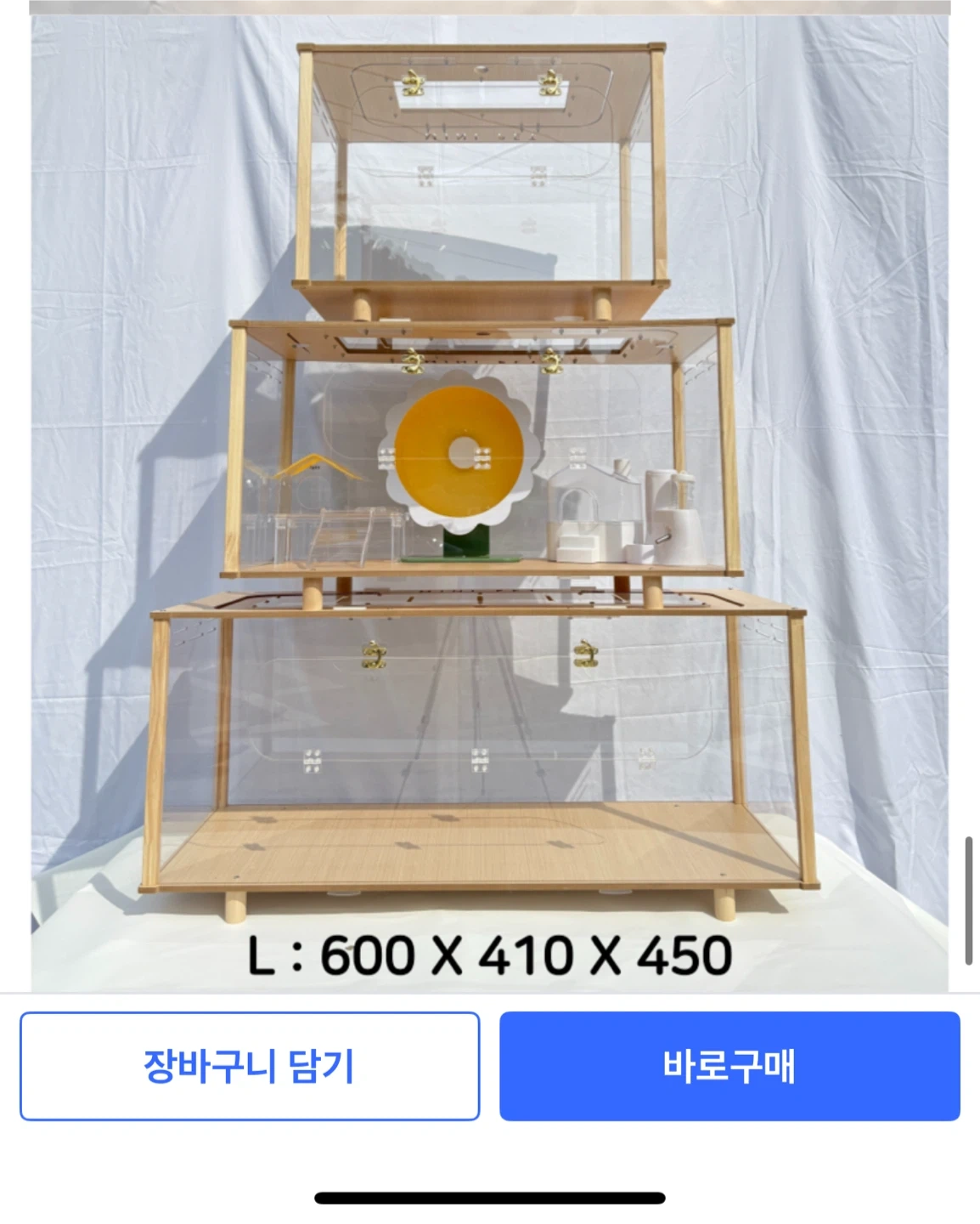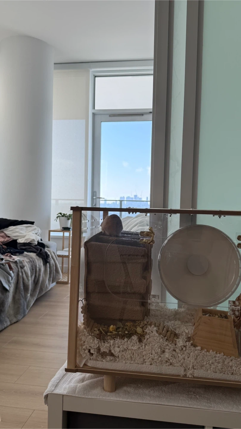 Lightly used. Shipped from Korea a month ago selling due to moving issues. Sturdy and clear Acrylic 3mm thick, small air holes for safety. Heavy Light oak wood frames for minimalistic look Two secured doors to access cage 600 cm L x 410cm W x 450cm H, fits my 12inch large hamster wheel. Asking for $100 OBO