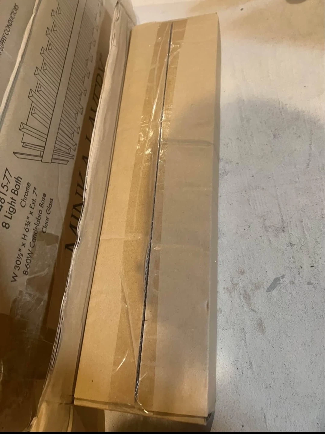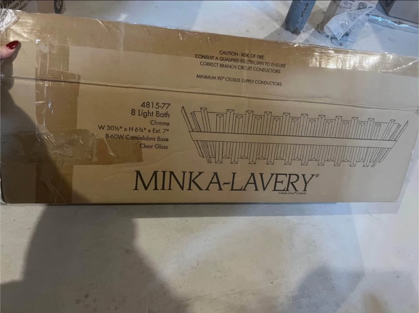 Selling a Minka-Lavery 8 Light Bath in chrome. It's still in the box! The dimensions are W 30 1/2" x H 6 1/4" x Ext. 7". It uses 8-60W candelabra base bulbs and has clear glass