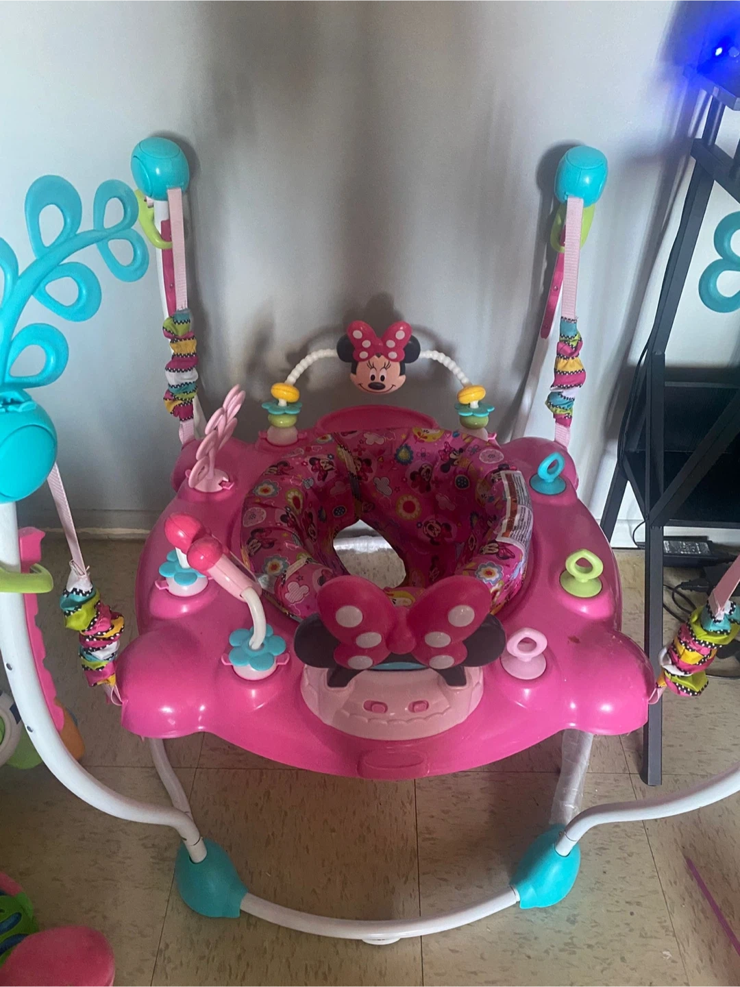 Selling a gently used Minnie Mouse baby jumper. It's in great condition and ready for a new little one to enjoy! The jumper features a fun and engaging design with Minnie Mouse details, perfect for keeping your baby entertained and active.