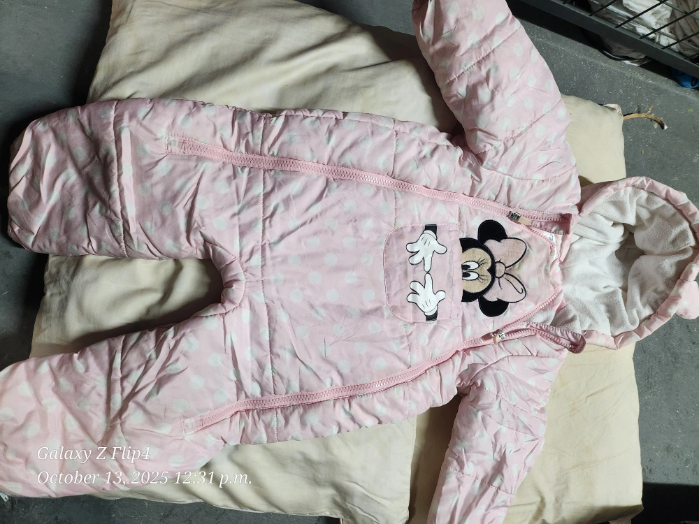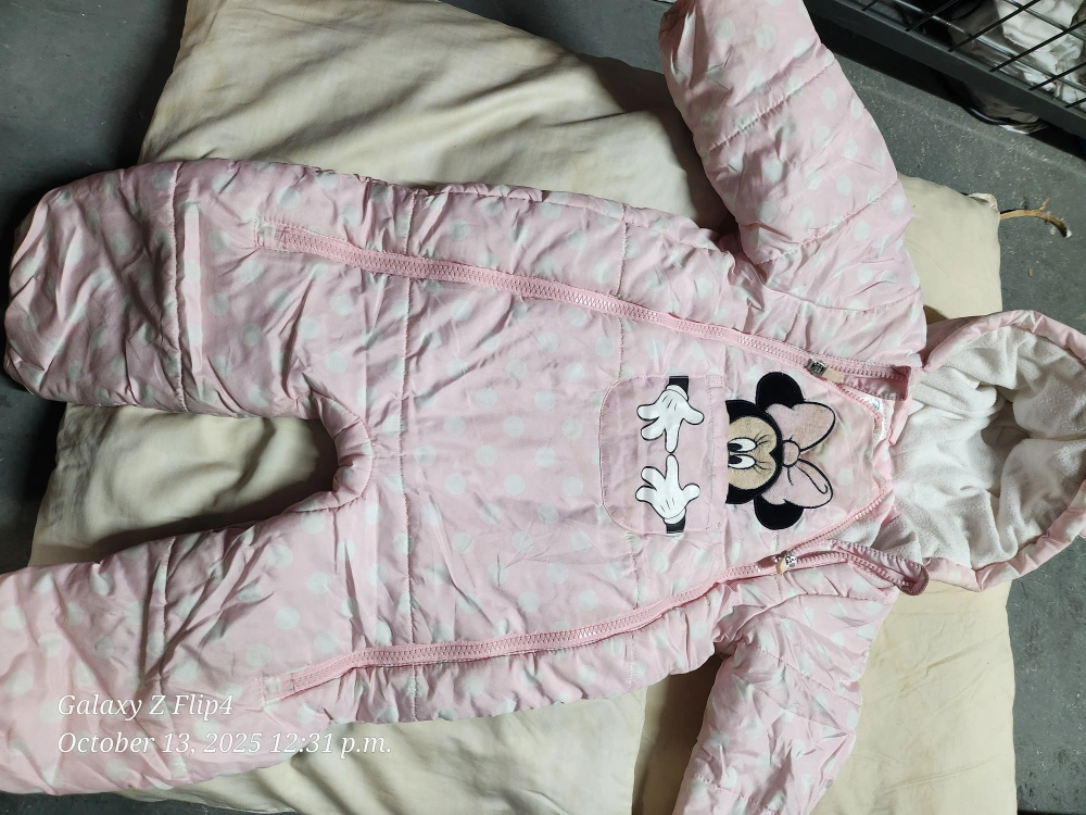 A cute Minnie Mouse snowsuit for your little one! It's pink with white polka dots and a Minnie Mouse design on the front. Perfect for keeping your baby warm and cozy during the winter months
