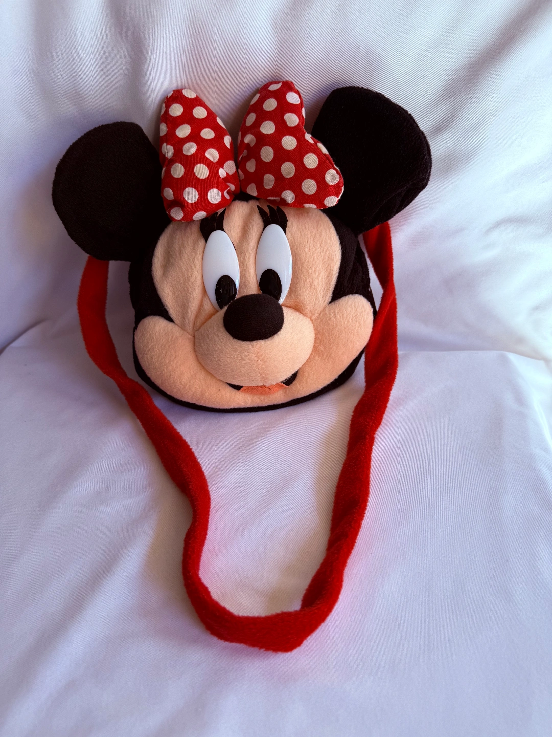Super cute Minnie Mouse plush shoulder bag! It's in great condition and perfect for any Disney fan. The bag measures approximately 9 inches in height and width. The shoulder strap is red and soft, making it comfy to carry around