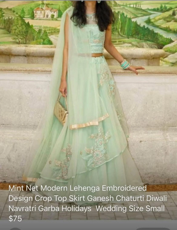 Beautiful mint green lehenga choli. Dress Skirt Crop Top. Modern design, net fabric with embroidered details. Small size. Perfect for weddings, festivals, prom, party or special occasions. Diwali Navratri Garba Karwa Karva Chauth Teej Christmas New Year Hindu Temple Punjabi Dance Teen Woman Stylish Modern Ethnic Indian Mississauga _ Windsor DM3139702047