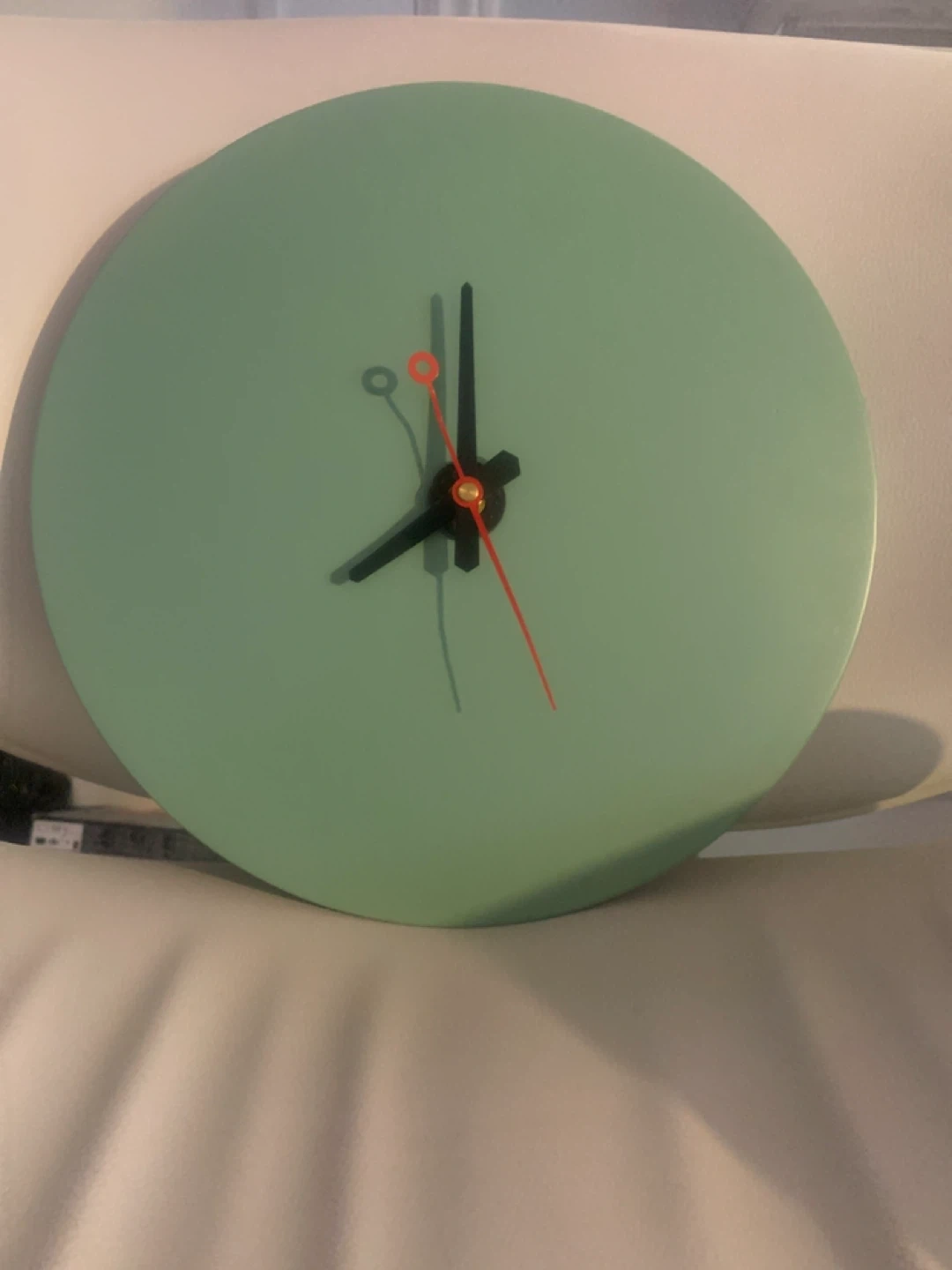 Selling a solid wood mint green wall clock. Very unique and modern with black hands and a red second hand.