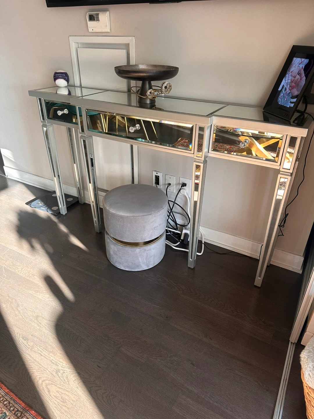 Selling a lovely mirrored console table! It features drawers with crystal-style knobs, adding a touch of elegance to any room. The mirrored finish gives it a bright and airy feel, perfect for entryways or living spaces. Also included is a grey velvet ottoman with a gold accent band in the middle.