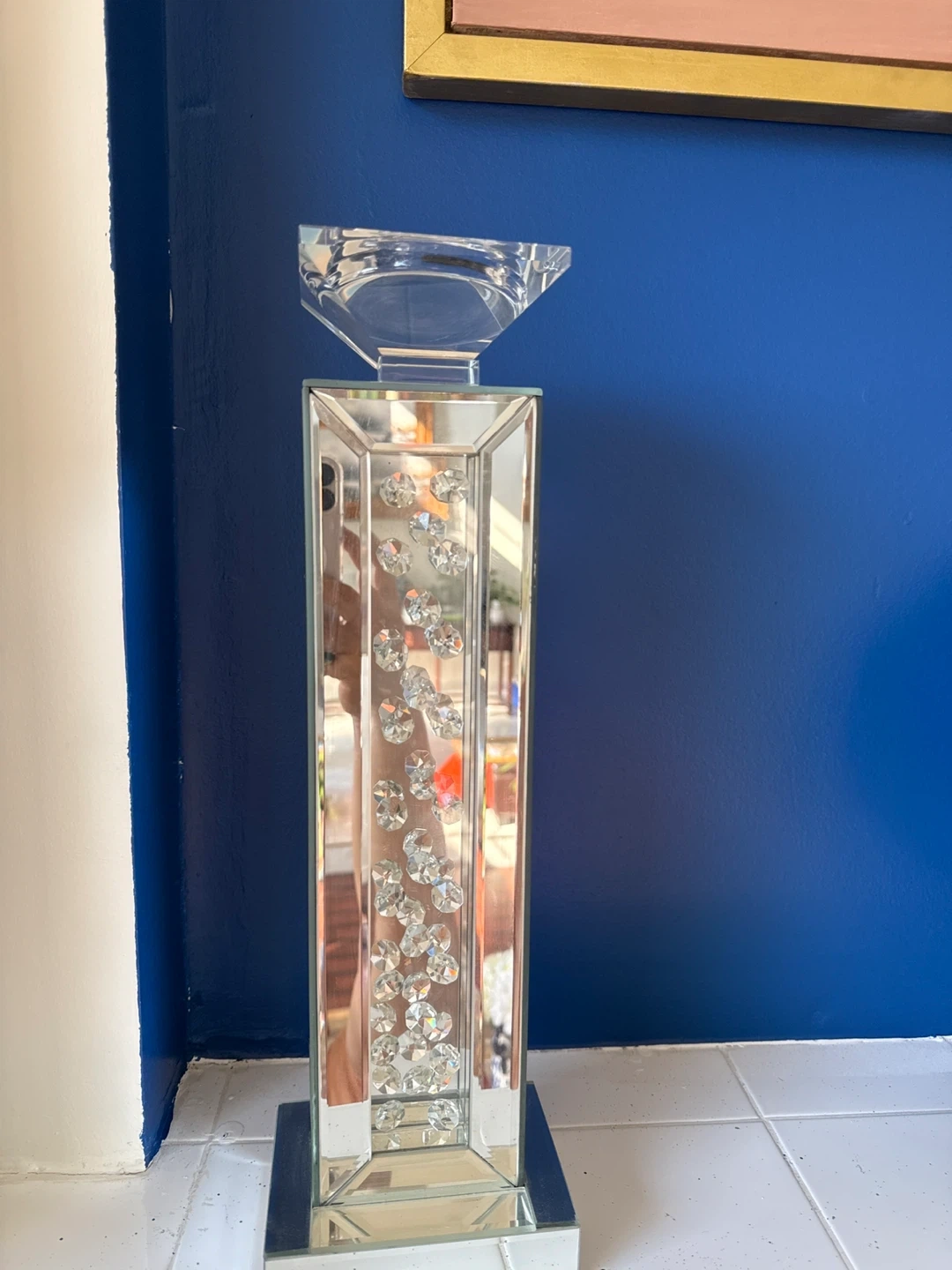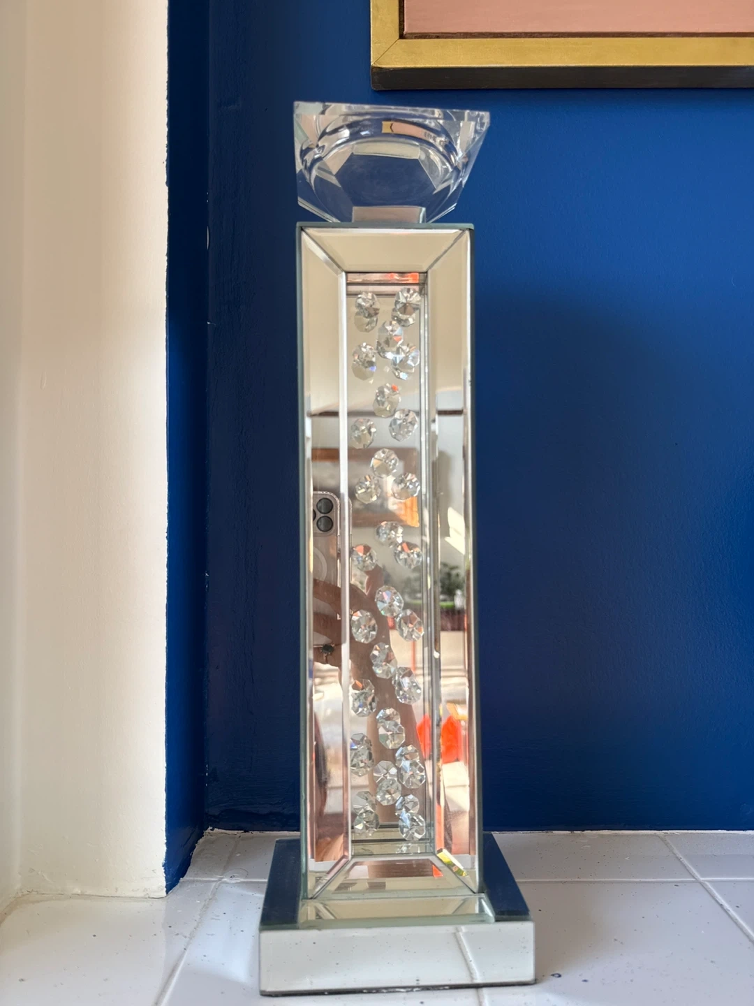 This is a mirrored candle holder with crystal accents. It's in great condition and would look lovely in any room of the house