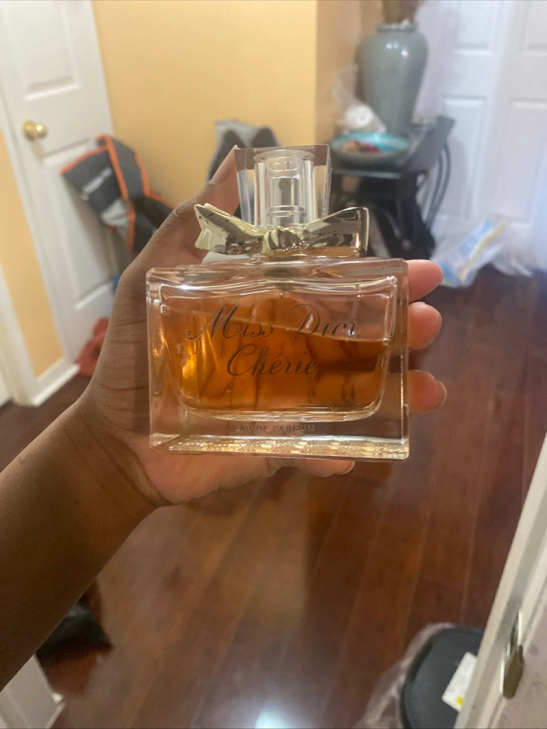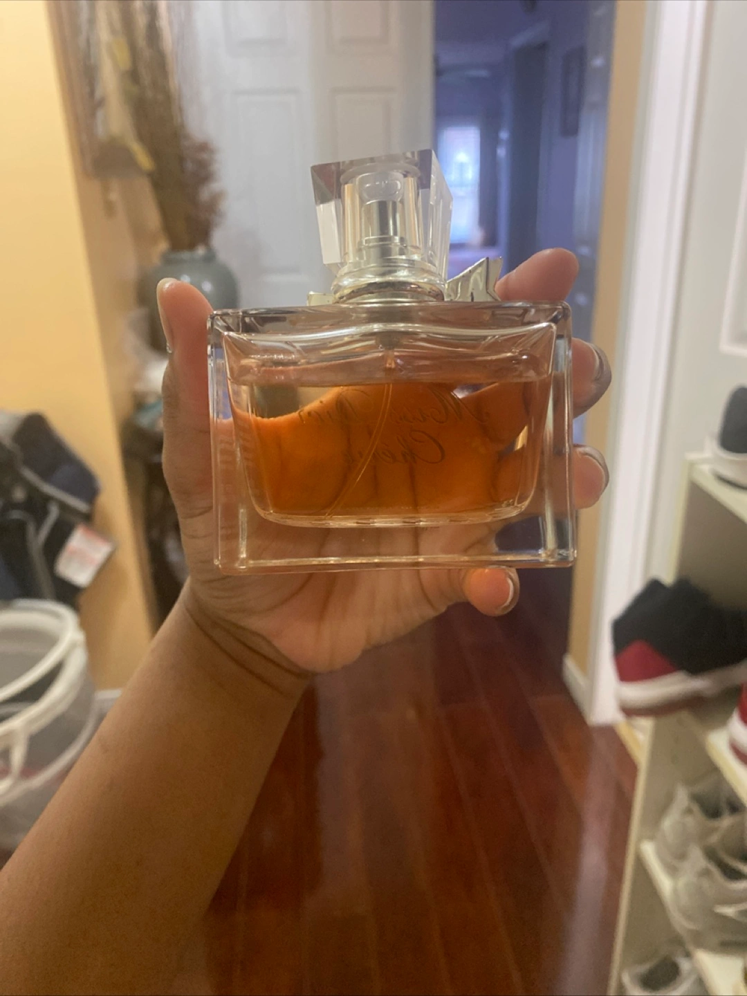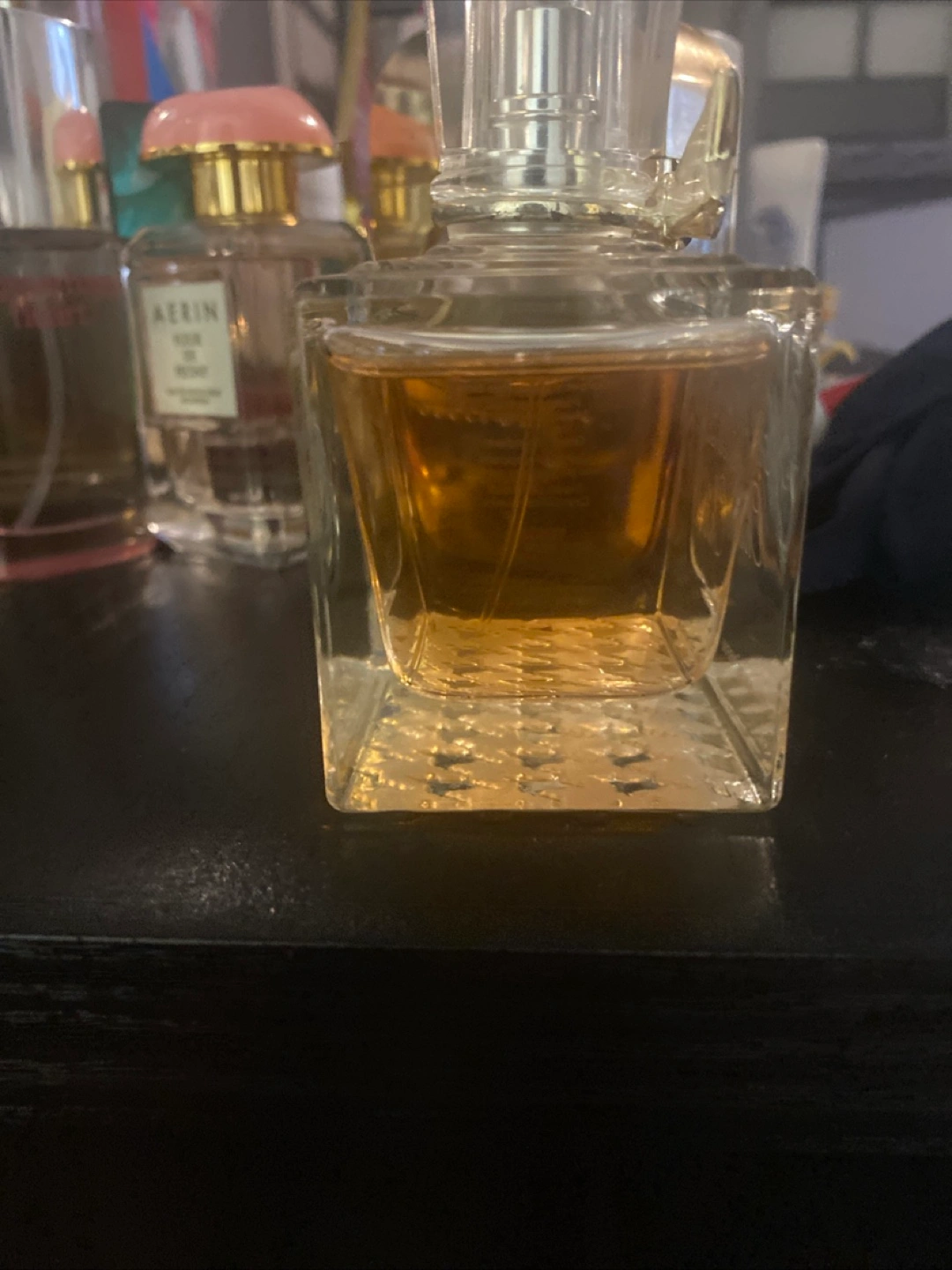 Elegant perfume bottle. Amber-coloured liquid. Square glass bottle with silver accents. Slight bow detail on the cap.