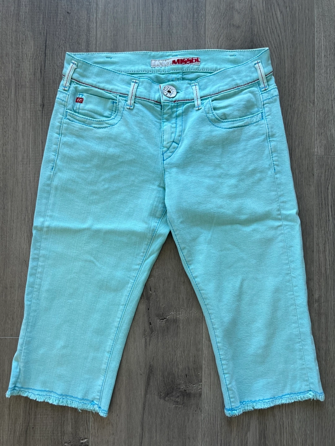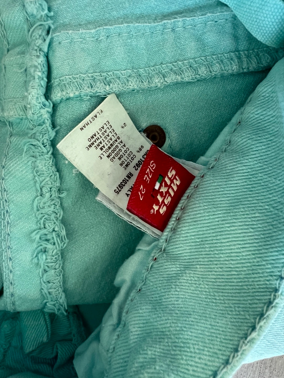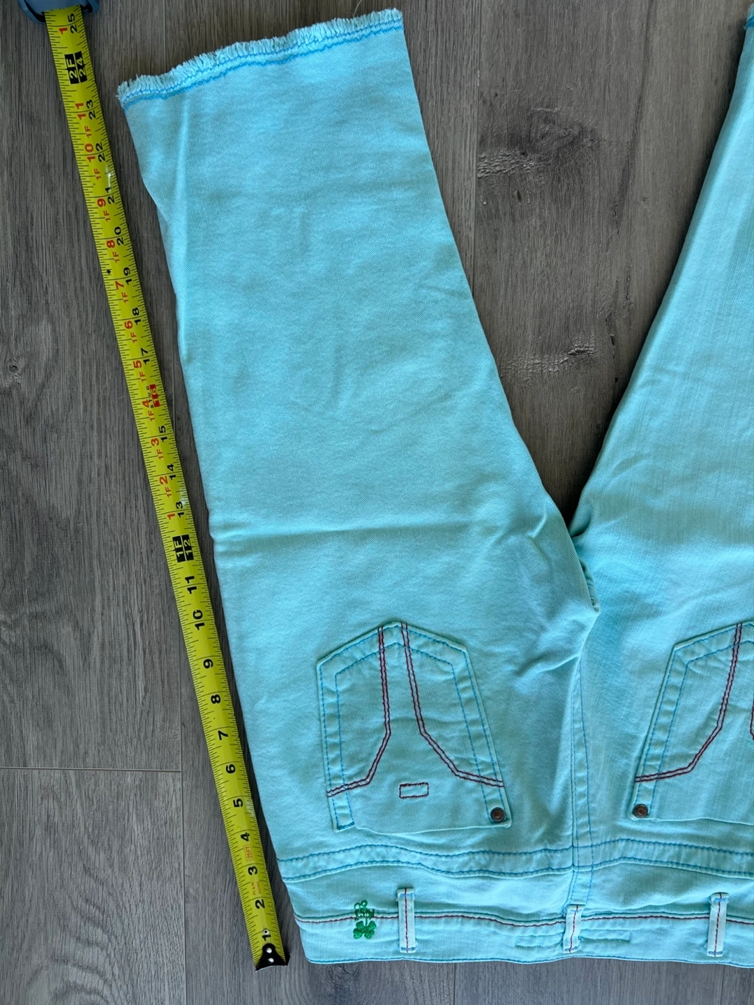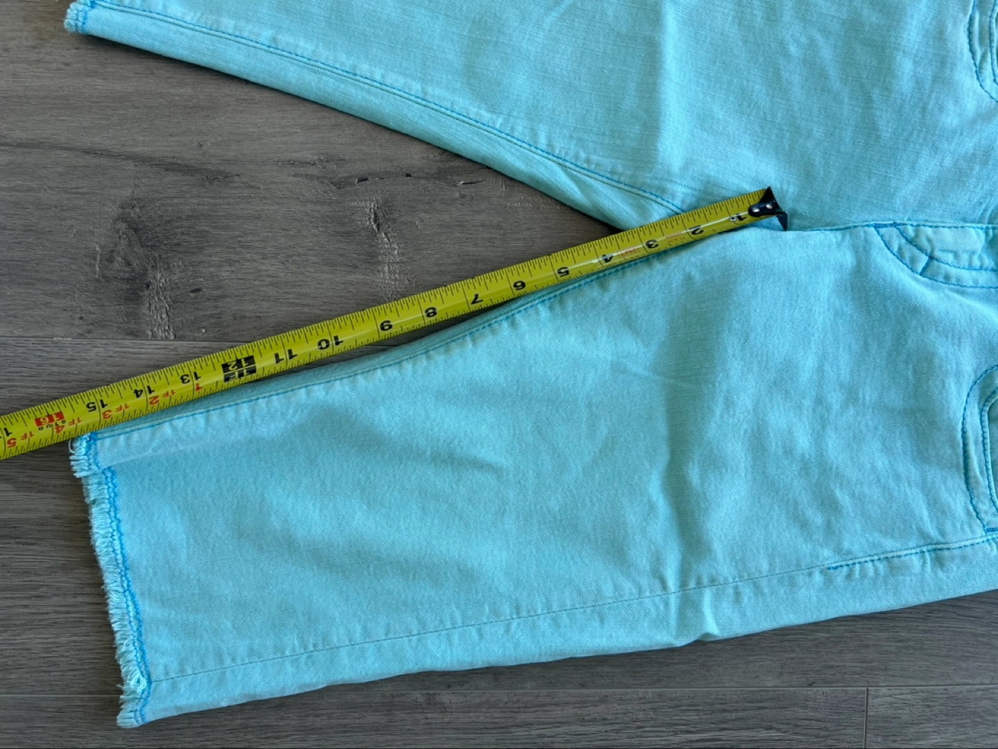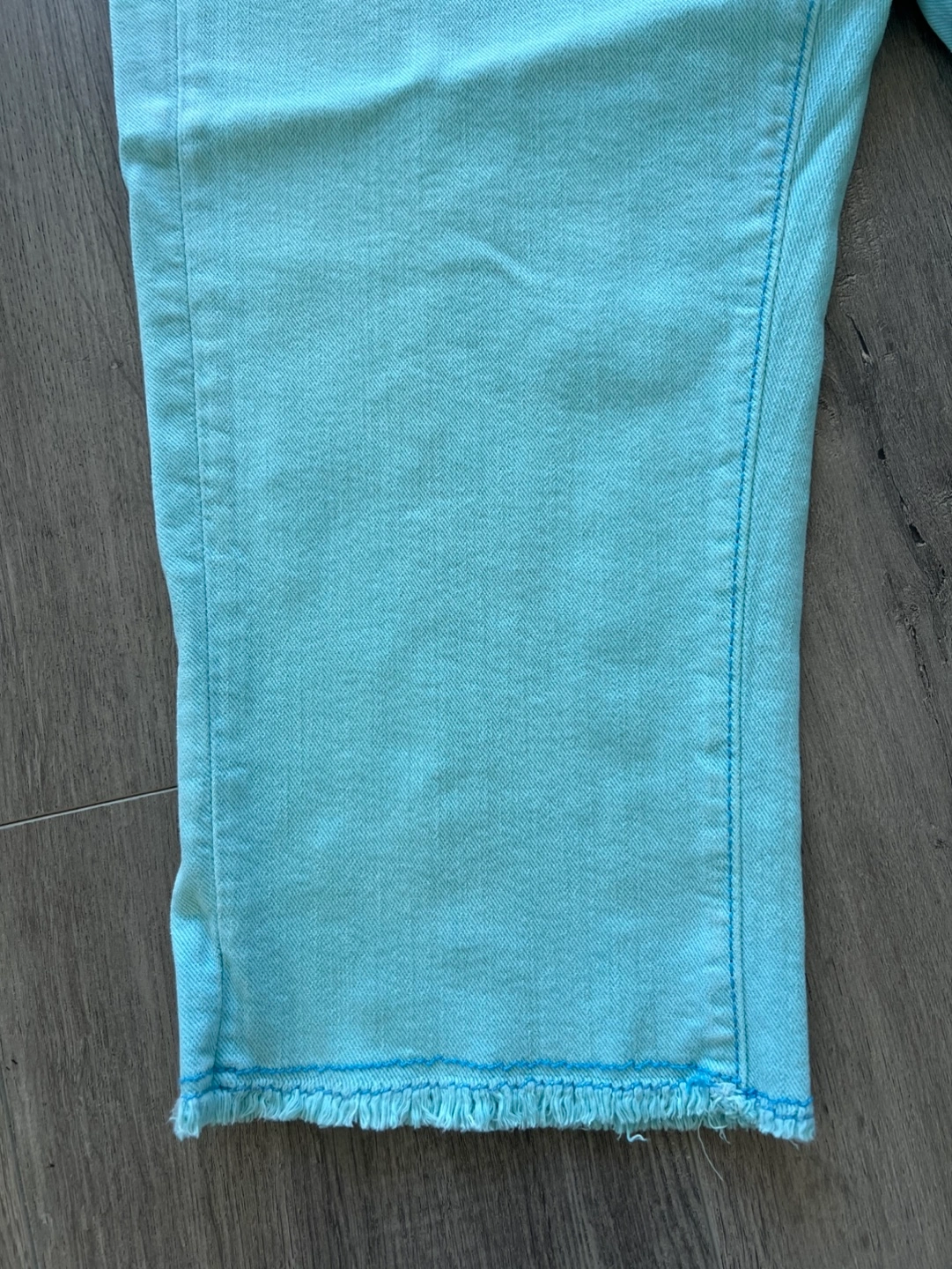 Turquoise denim capris. Raw hem. Size 27. Good condition.