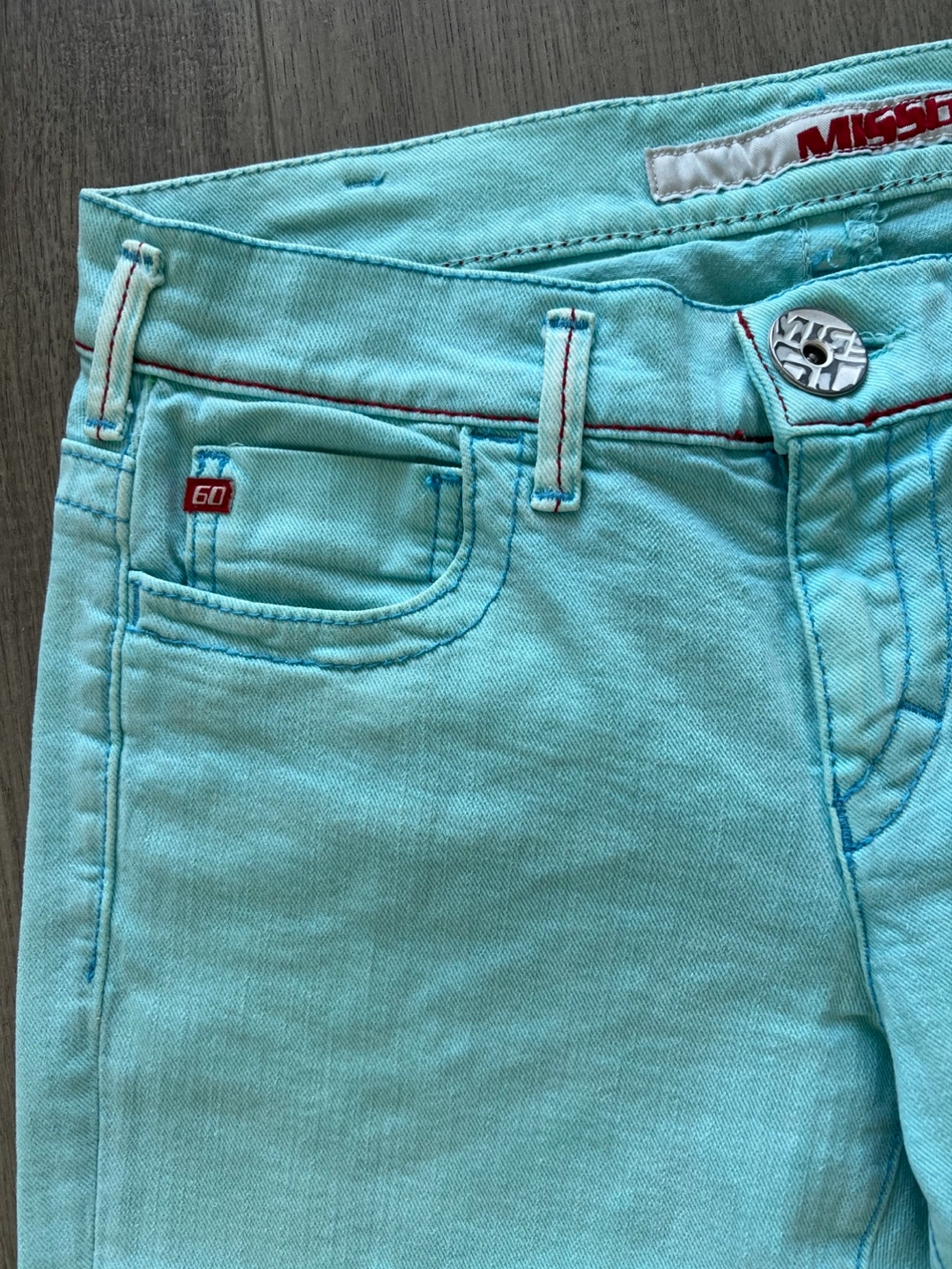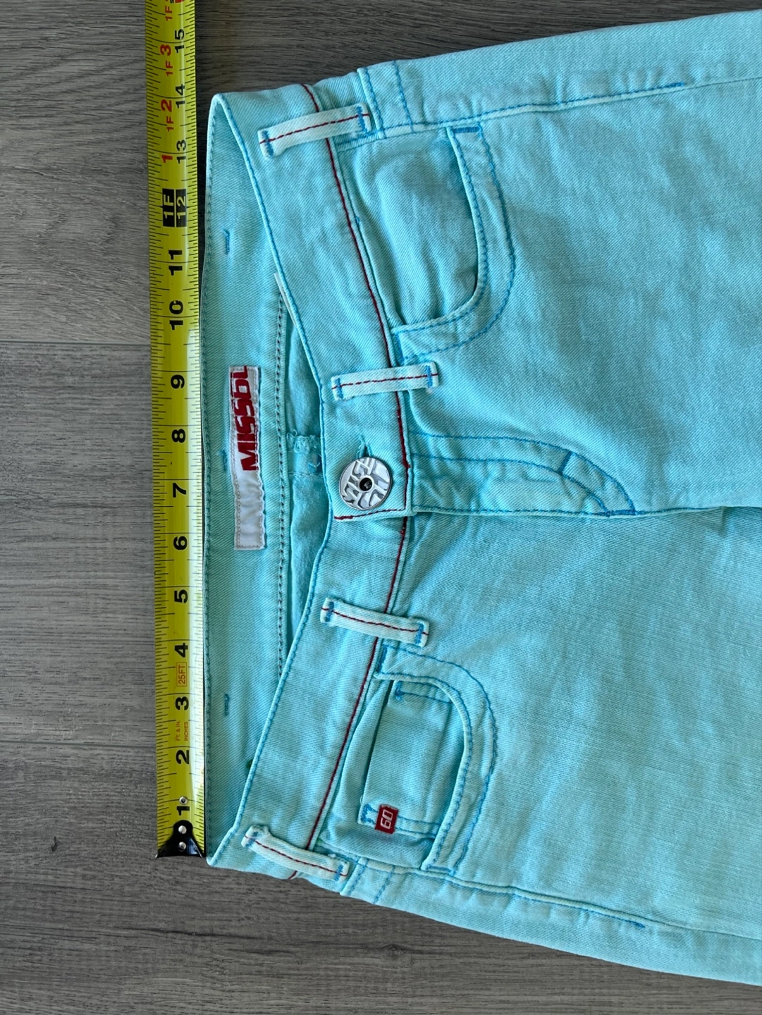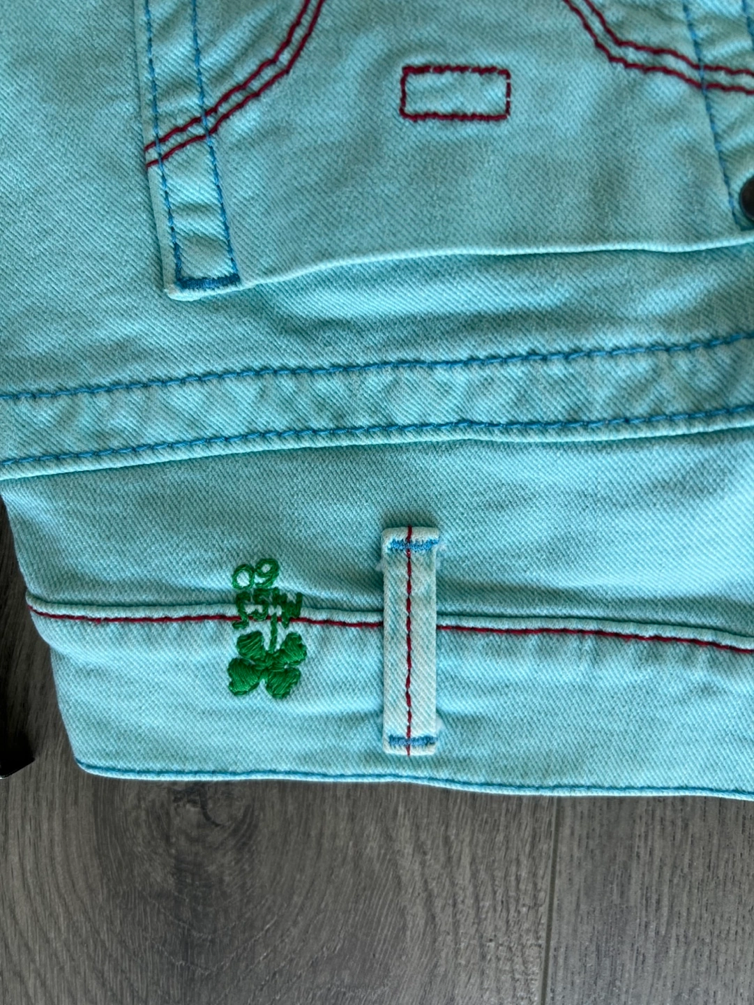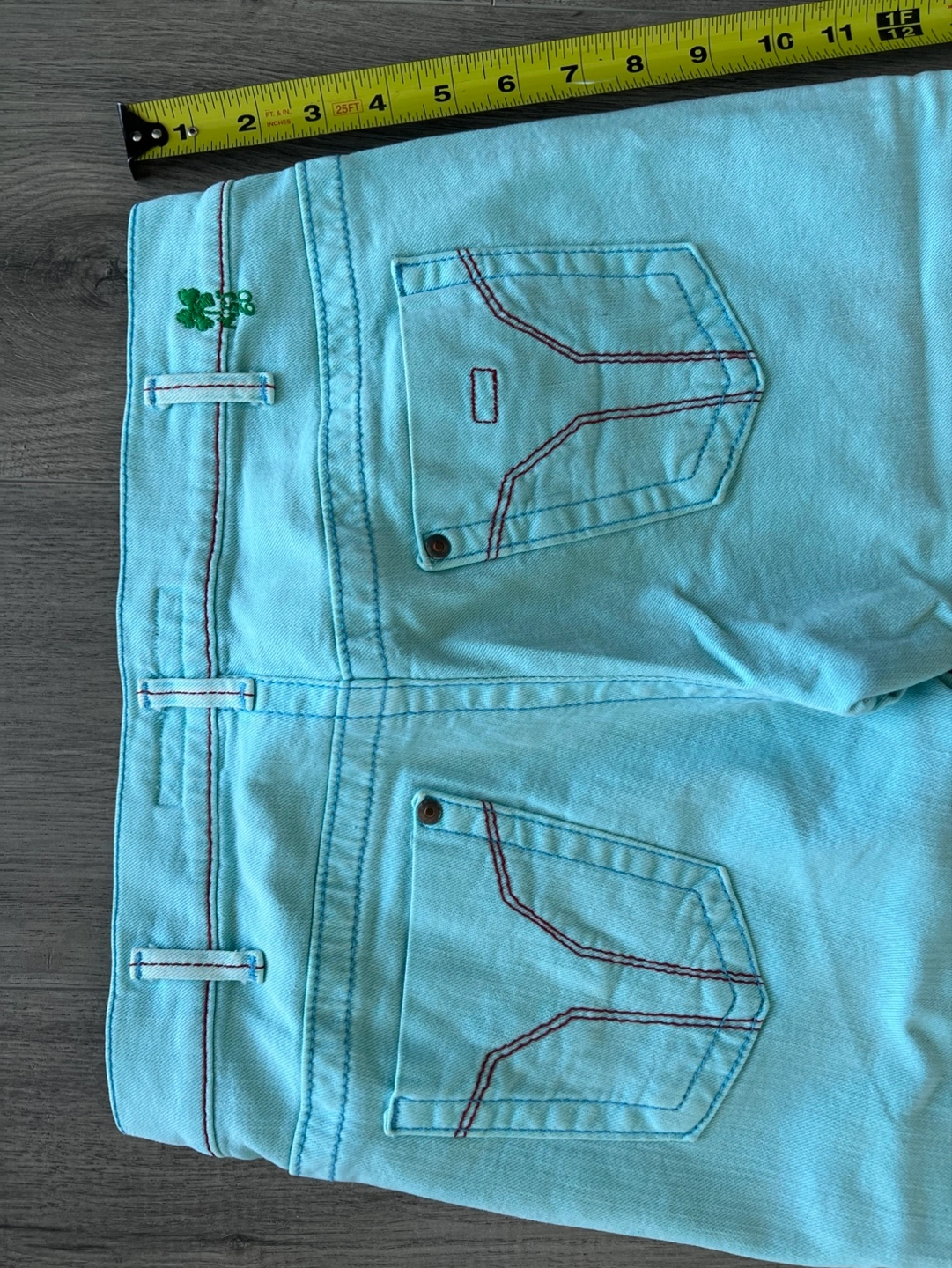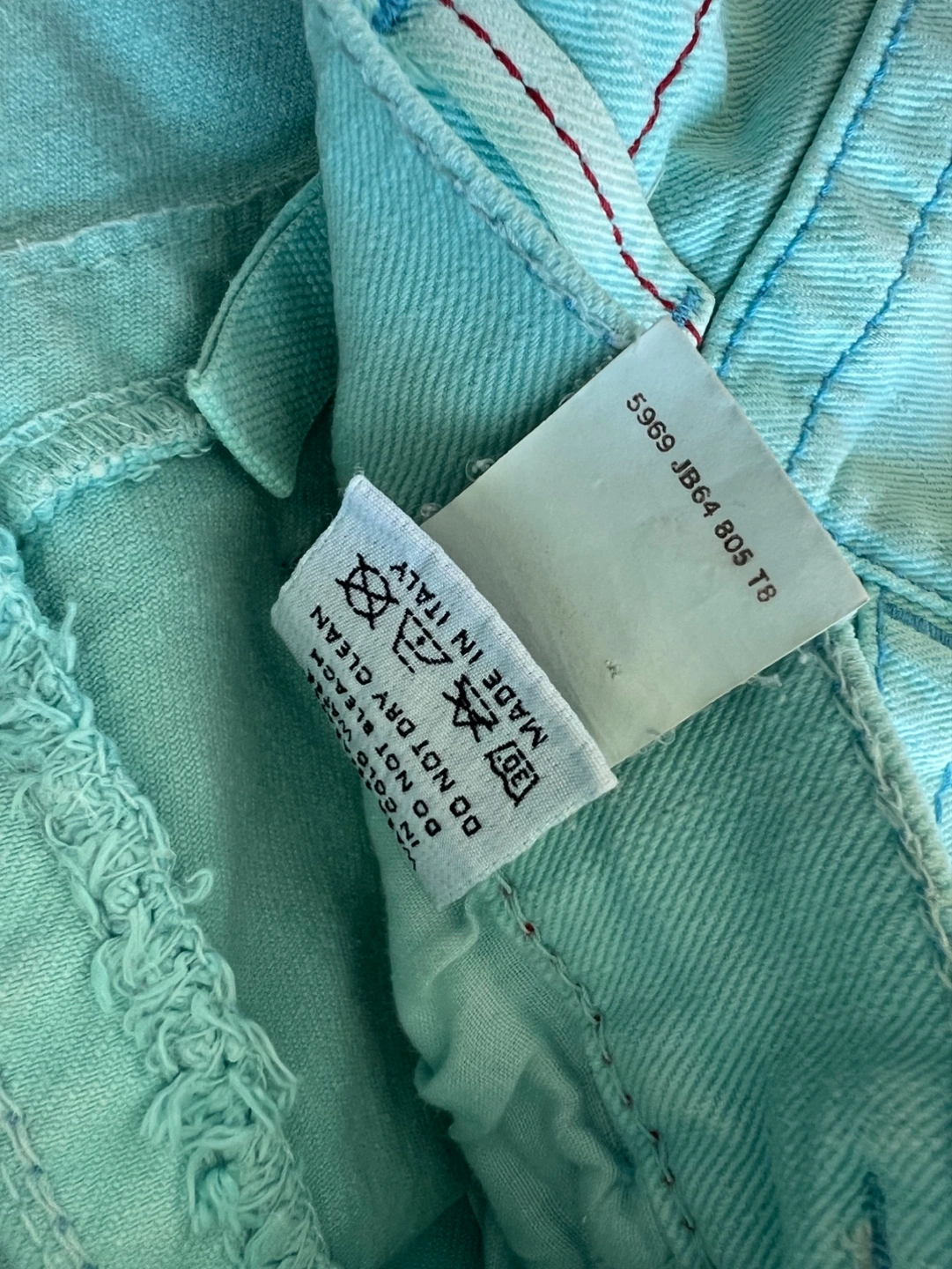Turquoise denim capris. Raw hem. Size 27. Good condition.